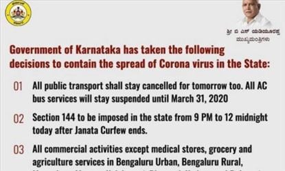 ജനത കർഫ്യുവ്വിനു പിന്നാലെ നിരോധനാഞ്ജ പ്രഖ്യാപിച്ചു കർണാടക. ദക്ഷിണ കന്നഡ, ബെംഗളൂരു, ബെംഗളൂരു റൂറൽ, കൽബുര്ഗി, മൈസൂരു, ദാര്വാഡ്, ബെലഗാവി, ചിക്കബെല്ലാപുര, കുടക് എന്നീ ജില്ലകളാണ് അടച്ചു പൂട്ടാൻ തീരുമാനിച്ചിരിക്കുന്നതെന്ന് വാര്ത്താ സമ്മേളനത്തിൽ മുഖ്യമന്ത്രി ബി എസ് യെഡിയൂരപ്പ അറിയിച്ചു. മെഡിക്കൽ, സ്റ്റോര്, പലചരക്ക്, കാര്ഷിക സേവനങ്ങൾ ഒഴികെയുള്ള മറ്റ് വാണിജ്യ സേവനങ്ങൾ എല്ലാം അടച്ചുപൂട്ടും.