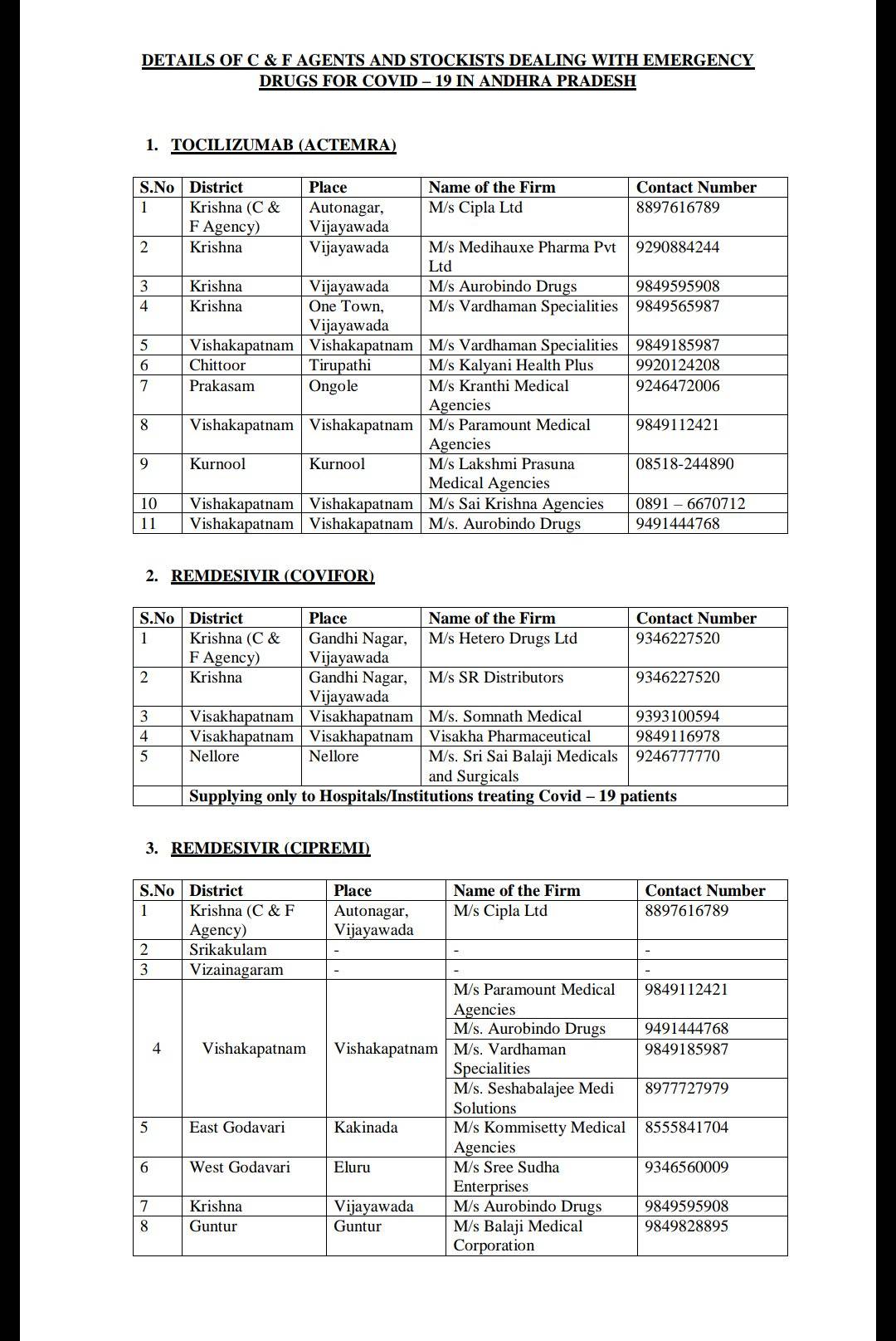 అయితే ఇక్కడ కరోనా చికిత్స అవసరమైన కొన్ని మందులను..అవి దొరికే ప్రదేశాలను మరియు అమ్మే వ్యక్తుల వివరాలను పొందుపరిచాం కావాల్సిన వాళ్ళు సదరు నంబర్ కు ఫోన్ చేసి వివరాలు అడిగి తెలుసుకోగలరు .