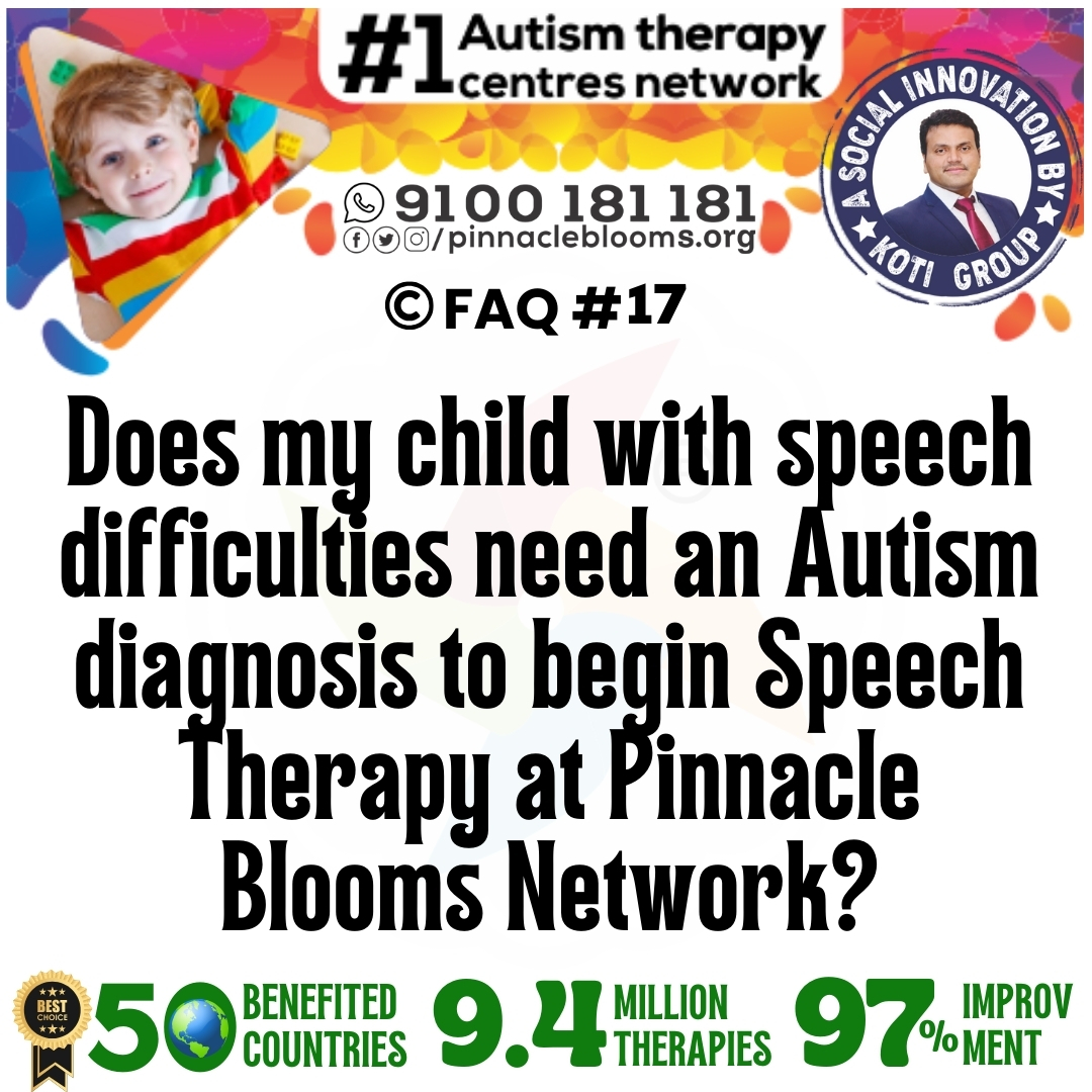 Certainly not! At Pinnacle Blooms Network, we believe in early intervention and progress. If your child shows any difficulties in speech and communication, they can undoubtedly benefit from our Speech Therapy services, regardless of an Autism diagnosis. Our expert therapists are here to help your child enhance their communication capabilities at their own pace.