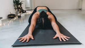 Kneel on the floor, sit back on your heels, and stretch your arms forward while lowering your chest toward the ground. Rest your forehead on the floor and take slow, deep breaths. Hold for 30–60 seconds.