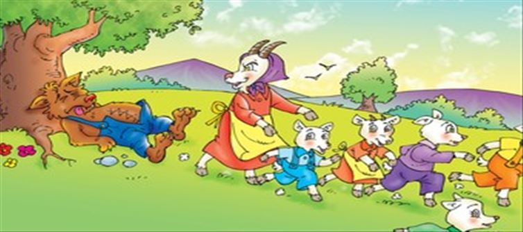 ఒక మేక తన ఏడుగురు పిల్లలతో అడవిలో ఉన్న గడ్డి మైదానంలో నివసించేది. ఒక రోజు మేక అడవి నుండి ప్రమాదకరమైన నల్ల తోడేలు వచ్చి తన పిల్లలను తినడానికి ప్రయత్నించడం గమనించింది. అప్పటి నుంచి తన పిల్లలను ఇంటి నుంచి బయటకు వెళ్లకుండా ఆపేసింది. ఒక రోజు మేక ఆహారం కోసం ఏర్పాట్లు చేయడానికి బయటకు వెళ్ళవలసి వచ్చింది. బయలుదేరే ముందు పిల్లలకు తల్లి “నా ప్రియమైన పిల్లలారా! ఇల్లు వదిలి బయటకు రావద్దు. ప్రమాదకరమైన తోడేలు తిరుగుతోంది. ఎవరైనా తలుపు తడితే,అడగకుండా తలుపు తెరవకండి. ఇది నల్ల తోడేలు. దీనికి నల్లటి కాళ్లు ఉన్నాయి. దాని గొంతు బొంగురుగా ఉంటుంది. ఇది దాని గుర్తింపు" అంటూ జాగ్రత్త చెప్పి వెళ్తుంది. తోడేలు తల్లి మేక ఇంటి నుంచి వెళ్లిపోవడం చూసి పిల్లలను తినడానికి దాని ఇంటికి వెళ్ళింది. తోడేలు తలుపు తట్టి "నేను మీ అమ్మను" అని చెప్పింది.