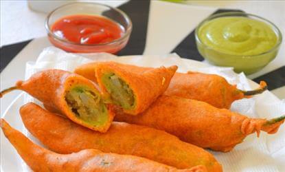 4. Heat the oil in a deep frying pan and dip the mulagu into the batter, one at a time.