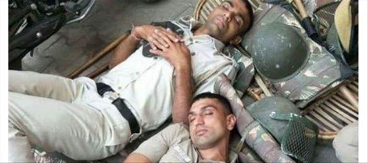 ആരോഗ്യപ്രവർത്തകരെ പോലെത്തന്നെ ഏറ്റവും കൂടുതൽ കൊവിഡ് 19 പ്രതിരോധത്തിൽ മുന്നിൽ നിൽക്കുന്നവരാണ് പൊലീസ്. ധരിക്കേണ്ട വസ്ത്രങ്ങൾ തലയിണകളാക്കി, ലാത്തിയും ഹെൽമെറ്റും, ഒരു വശത്തേക്ക് മാറ്റി വെച്ചാണ്, മേൽ സൂചിപ്പിച്ച പോലീസുകാരെ ചിത്രത്തിൽ കാണാൻ കഴിയുന്നത്. ചിത്രത്തിൽ കാണുന്ന സ്ഥലം കടത്തിണ്ണയാണ്.