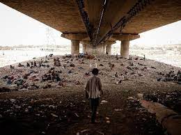 This picture is of 30 april 2022 New delhi, india, where after searching for Recyclable Material in the summer days, people pass through almost dry land of Yamuna.