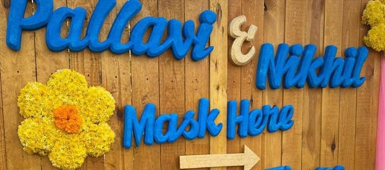 నిఖిల్ - పల్లవి వర్మ పెళ్లి వేడుకను కేవలం కొందరు సన్నిహితులు కుటుంబ సభ్యులు హాజరయ్యారని తెలుస్తోంది. పోలీసుల అనుమతి తీసుకొని పూర్తి నిబంధనలు భౌతిక దూరం పాటిస్తూ కొద్దిమంది సమక్షంలో వివాహ వేడుక జరిపించారు. నిఖిల్ - పల్లవి వర్మకు కొన్నేళ్ల నుంచి పరిచయం ఉంది. ఫిబ్రవరి మొదటి వారంలో గోవాలో కొందరు సన్నిహితుల మధ్య ఎంగేజ్ మెంట్ జరిగింది. ఈరోజు పెద్దలు నిశ్చయించిన సుముహార్తానికి వీరిద్దరూ వివాహ బంధంతో ఒక్కటయ్యారు. వివాహానికి హాజరైన బంధువులు నూతన వధూవరులను ఆశీర్వదించారు. వీరి పెళ్ళికి సంభందించిన వీడియోలు ఫోటోలు బయటకి వచ్చాయి. వీరిలో నిఖిల్ - పల్లవి వర్మలు తలంబ్రాలు చల్లుకుంటూ ఆనందంగా కనిపించారు. ఇప్పుడు సోషల్ మీడియా మాధ్యమాలలో నిఖిల్ పెళ్లి వీడియోలు షేర్ అవుతున్నాయి. కానీ వాటిలో ఓ ఫోటో మాత్రం నెటిజన్స్ ను ఒక్కసారిగా ఆకర్షించింది. ఇప్పుడున్న పరిస్థితులకు తగ్గట్టు తమ వెడ్డింగ్ బోర్డులో పెట్టిన చిన్న క్రేజీ థాట్ వైరల్ అయ్యింది. ఇంతకీ అందులో ఏముందంటే “మాస్క్ లు ఇక్కడున్నాయ్, శానిటైజర్లు అక్కడున్నాయ్, ప్రేమ అన్ని చోట్లా ఉంది” అంటూ వారి పెళ్లి ప్రాంగణానికి వచ్చిన వారికి చిన్న చిరునవ్వు వచ్చేలా చేసారు. దీనితో ఈ ఫోటో నెటిజన్స్ నిఖిల్ క్రేజీ థాట్ బాగుంది అని అంటున్నారు. ఇకపై అన్ని వివాహాలకు ఇదే ఫాలో అవుతారేమో.