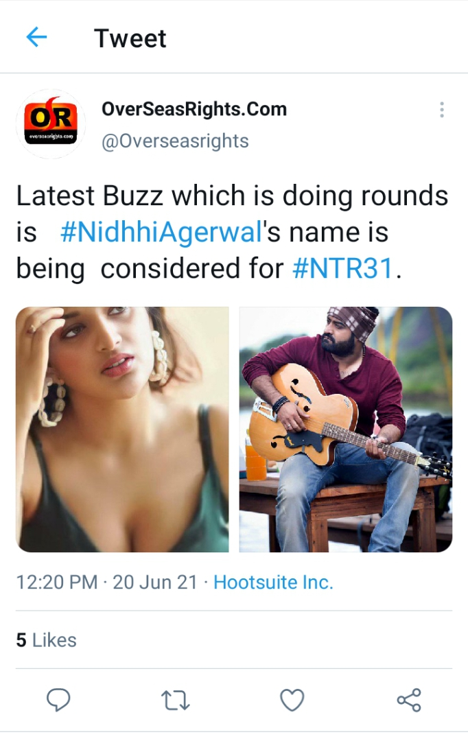 జూనియర్ ఎన్టీఆర్ సినీ ఇండస్ట్రీలో తాతకు తగ్గ మనవడిగా, పేరు ప్రఖ్యాతలు తెచ్చుకున్న విషయం తెలిసిందే. ప్రేక్షకులలో మంచి ఆదరణ పొందిన ఈయన విభిన్న కథలతో ప్రేక్షకుల ముందుకు వచ్చి, ఆనందింప చేస్తూ ఉంటారు. ముఖ్యంగా మాస్ హీరోగా, లవర్ బాయ్ గా పేరుతెచ్చుకున్న జూనియర్ ఎన్టీఆర్ ,ఇక ఆర్ ఆర్ ఆర్ మూవీ లో సరికొత్తగా ప్రేక్షకులను అలరించనున్న విషయం తెలిసిందే. ఈ చిత్రానికి దర్శక ధీరుడు రాజమౌళి దర్శకత్వం వహిస్తుండగా, స్టార్ హీరోలైన రామ్ చరణ్ , జూనియర్ ఎన్టీఆర్ లు కలిసి సంయుక్తంగా నటిస్తున్నారు. ఇక ఇది వరకే ఈ సినిమాను విడుదల చేయాలని అనుకున్నప్పటికీ ,కరోనా కారణంగా ఈ సినిమాను 2021 డిసెంబర్ 14వ తేదీకి వాయిదా వేశారు.ఇదిలా ఉండగా, జూనియర్ ఎన్టీఆర్ ఇటీవల తన పుట్టినరోజు సందర్భంగా తన 30,31 వ సినిమాలకు సంబంధించిన సమాచారాన్ని కూడా విడుదల చేయడం జరిగింది. ఇక ఆర్ ఆర్ ఆర్ మూవీ తరువాత జూనియర్ ఎన్టీఆర్ దర్శకుడు కొరటాల శివ దర్శకత్వంలో ఒక సినిమా చేయడానికి గ్రీన్ సిగ్నల్ కూడా ఇచ్చారు. అయితే ఇప్పటికే ఈ చిత్రంలో విలన్ పాత్రలో ఒక బాలీవుడ్ నటిని తీసుకోనున్నట్లు వార్తలు కూడా వినిపిస్తున్నాయి ఇక ఈ చిత్రానికి నిర్మాతలుగా తన అన్నయ్య నందమూరి కళ్యాణ్ రామ్ అలాగే సుధాకర్ మిక్కిలినేనిలు సంయుక్తంగా కలిసి ఈ చిత్రాన్ని నిర్మించనున్నారు. ఇక 2022 ఏప్రిల్ 29వ తేదీన థియేటర్లలోకి విడుదల చేయాలని కూడా భావిస్తోంది చిత్రబృందం.ఇక అయితే ఇప్పుడు మరోసారి జూనియర్ ఎన్టీఆర్ తన 31వ చిత్రానికి సంబంధించిన హీరోయిన్ ని కూడా అనుకుంటున్నట్లు సమాచారం. కొరటాల శివ దర్శకత్వంలో సినిమా పూర్తవగానే ప్రశాంతి నీల్ దర్శకత్వంలో హై వోల్టేజ్ యాక్షన్ అలాగే ఎంటర్టైన్మెంట్ చిత్రాన్ని తీయడానికి గ్రీన్ సిగ్నల్ ఇచ్చారు జూనియర్ ఎన్టీఆర్. ఇక ఈ చిత్రాన్ని 'మైత్రి మూవీ మేకర్స్-గురించి లేటెస్ట్ అప్డేట్స్, ఫోటోలు, వీడియోల కొరకు వెంటనే క్లిక్ చేయండి. 'మైత్రి మూవీ మేకర్స్ వాళ్లు నిర్మిస్తున్నారు.తాజాగా ఈ సినిమాకు హీరోయిన్ గా ఇస్మార్ట్ బ్యూటీ నిధి అగర్వాల్ ను తీసుకోనున్నట్లు ఓవర్సీస్ రైట్స్ వారు తమ అధికారిక ట్విట్టర్ ద్వారా వెల్లడించారు. అయితే ప్రస్తుతం హీరోయిన్గా ఈమె పేరు వినిపిస్తోందని సమాచారం..
