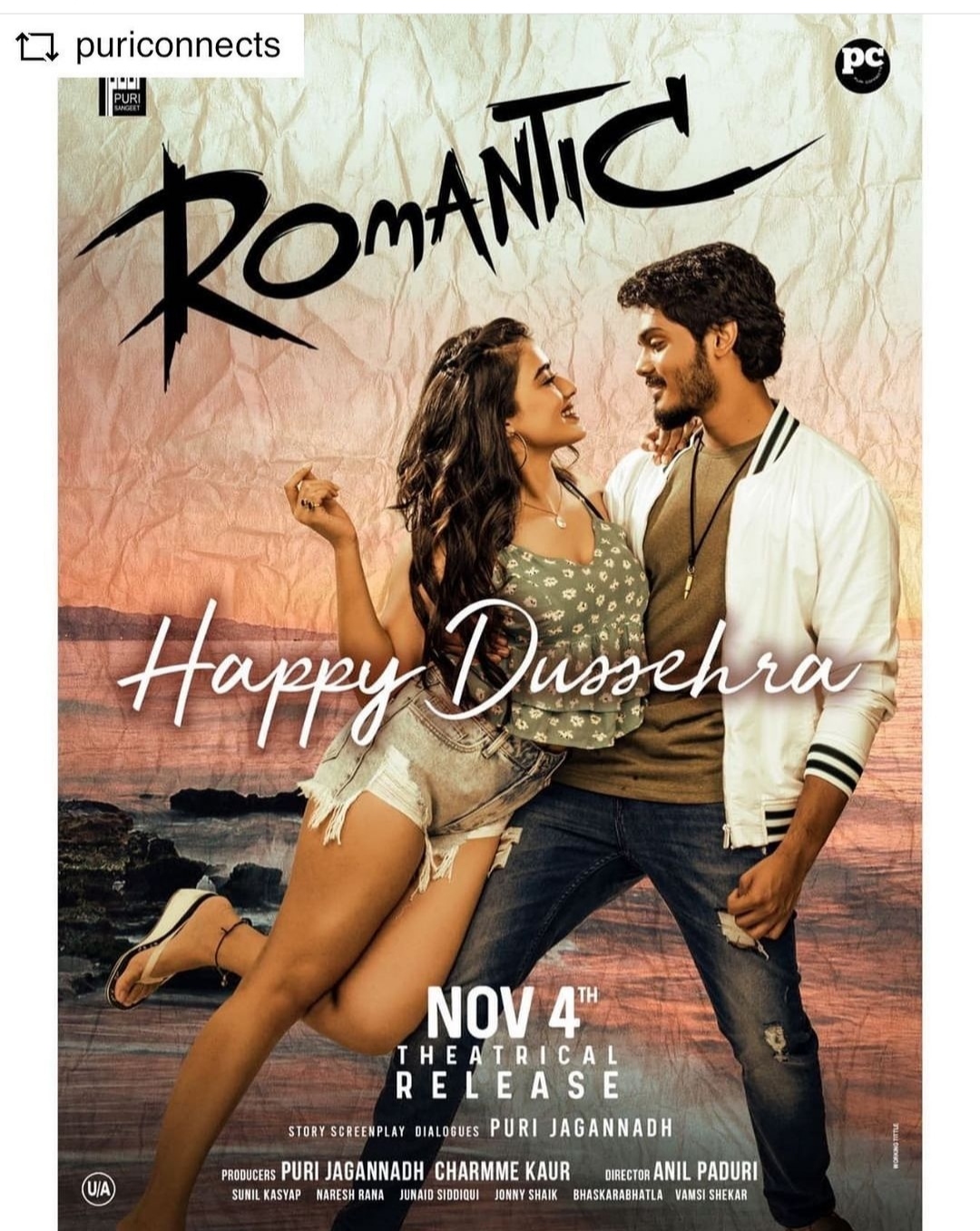 ఇప్పటికే ఈ చిత్రం నుండి విడుదలైన ప్రచార చిత్రాలకు జనాల నుండి మంచి రెస్పాన్స్ రావడం మాత్రమే కాకుండా, ఈ సినిమాపై ఉన్న అంచనాలను మరింత పెంచాయి అని చెప్పవచ్చు. అయితే ఇలా జనాలలో మంచి అంచనాలను క్రియేట్ చేసుకున్న రొమాంటిక్ సినిమాను నవంబర్ 4 వ తేదీన విడుదల చేయబోతున్నట్లు చిత్ర బృందం ఇప్పటికే అఫీషియల్ గా ప్రకటించింది. ఇది ఇలా ఉంటే రొమాంటిక్ చిత్ర బృందం తాజాగా దసరా సందర్భంగా ఒక పోస్టర్ ను సోషల్ మీడియా వేదికగా విడుదల చేశారు. ఈ పోస్టర్ ద్వారా ప్రేక్షకులకు రొమాంటిక్ చిత్ర బృందం దసరా శుభాకాంక్షలు తెలియజేసింది. ఈ సినిమా లో కేతిక శర్మ హీరోయిన్ గా నటిస్తోంది. అనిల్ పూధూరి దర్శకత్వం వహిస్తున్న ఈ సినిమాకు పూరి జగన్నాథ్, ఛార్మి కౌర్ నిర్మాతలు. రొమాంటిక్ సినిమా కు పూరి జగన్నాథ్ నిర్మాత మాత్రమే కాకుండా కథ , స్క్రీన్ ప్లే , డైలాగులను కూడా అందించాడు. మరి ఈ సినిమాతో ఆకాష్ పూరి బాక్సాఫీస్ వద్ద ఎలాంటి విజయా న్ని సాధిస్తారు తెలియాలి అంటే సినిమా విడుదల తేదీ వరకు వేచి చూడాల్సిందే.
