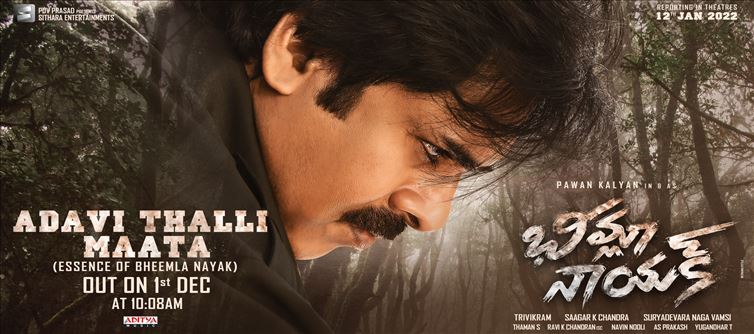 పవర్ స్టార్ పవన్ కళ్యాణ్, దగ్గుపాటి రానా  హీరోలుగా తెరకెక్కిన సినిమా భీమ్లా నాయక్, ఈ సినిమాకు సాగర్ కే చంద్ర దర్శకత్వం వహించగా మాటల మాంత్రికుడు త్రివిక్రమ్ శ్రీనివాస్ ఈ సినిమాకు స్క్రీన్ ప్లే అందిస్తున్నాడు, ఈ సినిమాలో నిత్య మీనన్, సంయుక్త మీనన్ హీరోయిన్ లుగా  నటిస్తున్నారు. ఇప్పటికే ఈ సినిమాకు సంబంధించిన కొన్ని ప్రచార చిత్రాలను, టీజర్ లను, పాటలను చిత్ర బృందం విడుదల చేయగా వీటికి జనాల నుండి అదిరిపోయే రెస్పాన్స్ వచ్చింది, ఇప్పటికే జనాలలో మంచి అంచనాలు కలిగి ఉన్న భీమ్లా నాయక్ సినిమాను సంక్రాంతి కానుకగా జనవరి 12 వ తేదీన విడుదల చేయబోతున్నట్లు కొన్ని రోజుల క్రితమే చిత్ర బృందం అఫీషియల్ గా ప్రకటించింది. ఇలా ఈ సినిమా విడుదల తేది దగ్గర పడడంతో చిత్ర బృందం ప్రమోషన్ ల స్పీడ్ పెంచింది, అందులో భాగంగా తాజా గా అడవి తల్లి మాట అనే లిరికల్ వీడియో సాంగ్ ను చిత్ర బృందం విడుదల చేసింది. 'అడవి తల్లి మాట' పాటకు థమన్ అదిరిపోయే  ట్యూన్ ను సమకూర్చడు. ఈ పాట కు రామజోగయ్య శాస్త్రి సాహిత్యం ని అందించాడు. ఈ పాట ని జానపద గాయని కుమ్మరి దుర్గవ్వ మరియు సాహితీ చాగంటి కలిసి ఆలపించారు. ఇద్దరు వ్యక్తుల మధ్య ఉండే అహం - ఆత్మాభిమానం నేపథ్యం లో 'భీమ్లా నాయక్' సినిమా ను తెరకెక్కిస్తున్నారు.
