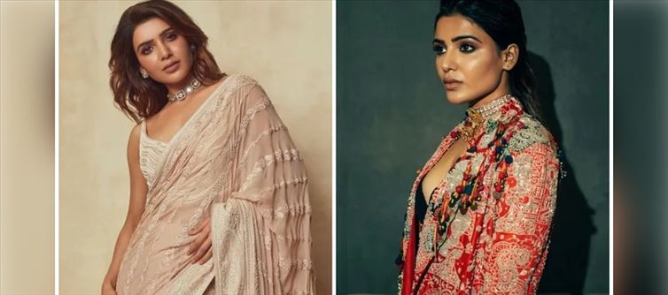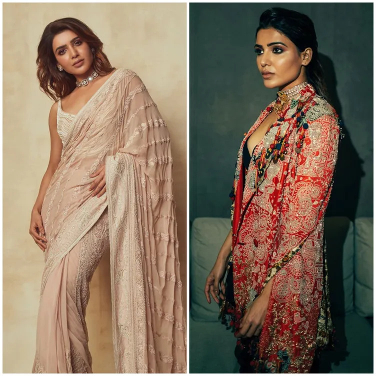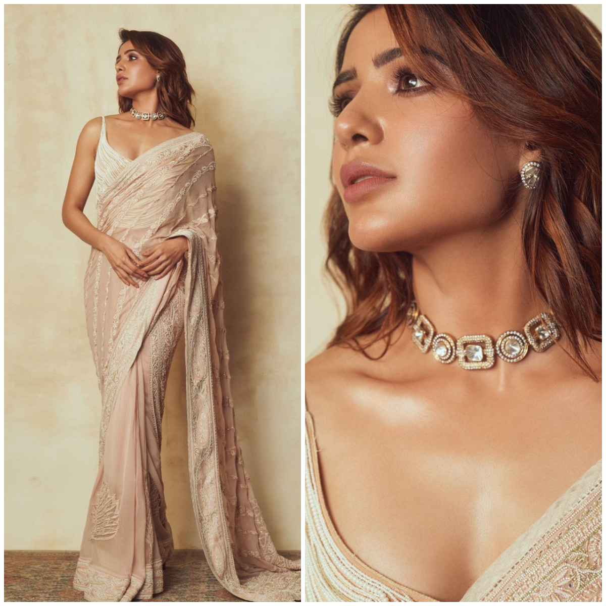 In her most recent two photoshoots, she once again proved that she can pull off any style with ease. sam stunned us with her style, which included a stunning beige saree and a three-piece Indo-Western set. Continue reading to figure out how to read both of her expressions. sam was dressed in a stunning abhishek Sharma beige sheer saree by Preetham Jukalker for a star-studded occasion.
