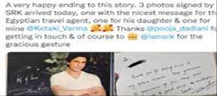 aswini later visited egypt, thanked that travel agent, and asked him to send a photo of Shah Rukh Khan and his daughter's autograph in it to SRK's red Chillies Entertainment. Shah Rukh Khan responded with love to the person and wrote a letter with his autograph in it. Shah Rukh Khan's letter and his deed have spread on twitter and social media and have been praised by his fans.