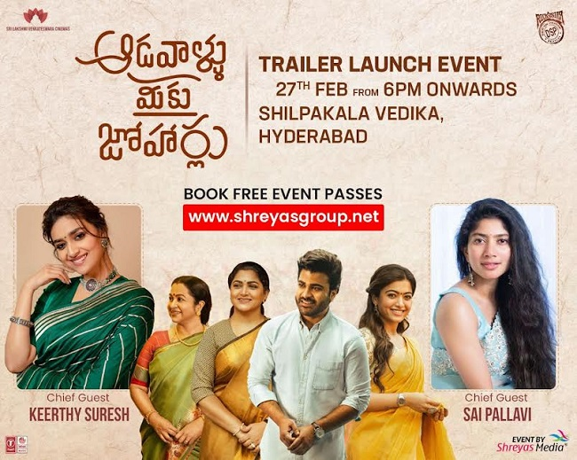 ఆడవాళ్లు మీకు జోహార్లు సినిమా ట్రైలర్ ఈ నెల 27వ తేదీన హైదరాబాద్ లోని శిల్పకళా వేదికలో రిలీజ్ చేయనున్నారు... ఇందుకు ముఖ్యఅతిథులుగా స్టార్ హీరోయిన్ అయిన సాయి పల్లవి- అలాగే కీర్తి సురేష్ హాజరవుతున్నారని చిత్రబృందం తెలియజేస్తున్నారు. అయితే ఈ సినిమా వాస్తవానికి మహిళల గొప్పతనాన్ని ఉద్దేశించి చిత్రీకరించడం జరిగింది. ఇక ట్రైలర్ ను విడుదల చేయడానికి ఈ ఇద్దరు హీరోయిన్లు ముఖ్య అతిథులుగా హాజరు కావడానికి ముఖ్యకారణం సినిమా  కోసమే అన్నట్టుగా తెలియజేస్తూ. డైరెక్టర్సినిమా అన్ని వర్గాల ప్రేక్షకులను ఆకట్టుకునేలా రాశారని.. ఇక అంతే కాకుండా పాటలు కూడా దేవిశ్రీప్రసాద్ బాగా సమకూర్చగా.. ఈ సినిమాకి సుజిత్ సారంగ్  సినిమాటోగ్రఫీ గా పనిచేశారు.ఇక ఈ సినిమాకి ఎన్నో జాతీయ అవార్డులు అందుకున్న శ్రీకర్ ప్రసాద్ ఎడిటింగ్ గా పని చేయడం జరిగింది. ఇక ఇందులో ముఖ్యంగా అలనాటి హీరోయిన్లు ఊర్వశి, రాధిక, ఖుష్బూ తదితర హీరోయిన్లు నటిస్తుండటం గమనార్హం. అయితే ఈ ట్రైలర్ రిలీజ్ ఈవెంట్ కు ప్రత్యేకించి హీరోయిన్ కీర్తి సురేష్, సాయి పల్లవి ని ఎంపిక చేయడం వెనుక అసలు కారణం ఏమిటా అని తెలుసు కోవడానికి ఆసక్తిగా ఎదురు చూస్తున్నారు ప్రేక్షకులు.. అయితే ఇది కేవలం ఆడవాళ్లు మీకు జోహార్లు అన్న టైటిల్ కారణంగానే ఇద్దరికీ అర్హత ఉందని భావించి వీరిని పిలిచి ఉండొచ్చని సమాచారం.