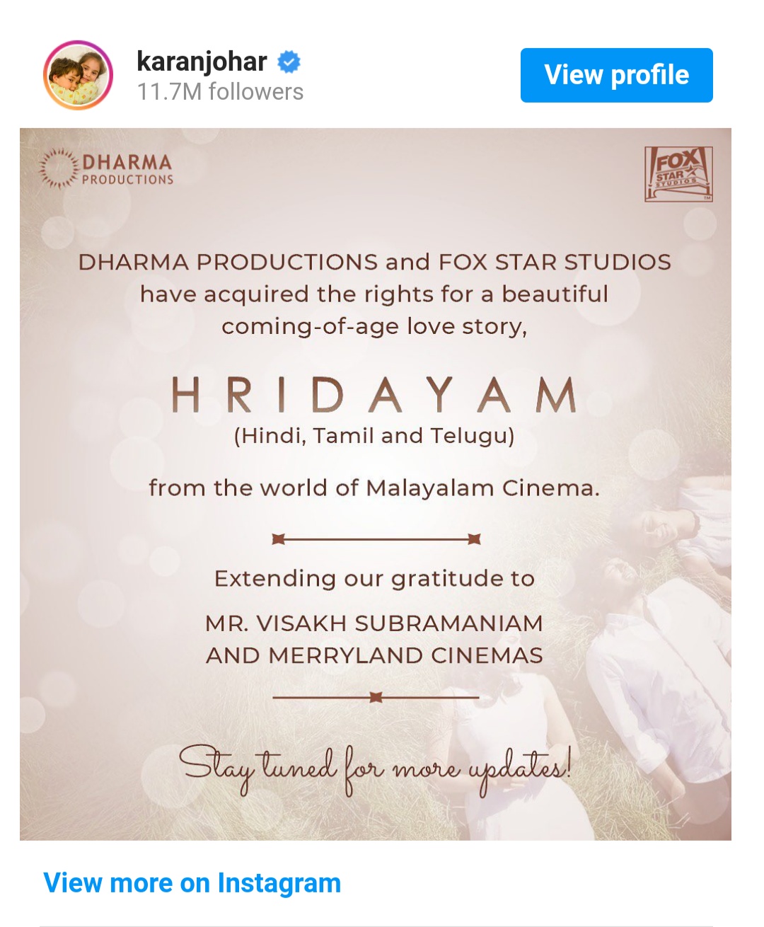 అతను ఇలా వ్రాశాడు, “ఈ వార్తను మీతో పంచుకోవడం నాకు చాలా ఆనందంగా మరియు గౌరవంగా ఉంది. ధర్మ ప్రొడక్షన్స్ & ఫాక్స్ స్టార్ స్టూడియోస్ దక్షిణాది నుండి మలయాళ సినిమా ప్రపంచం మొత్తం మీద హిందీ, తమిళం & తెలుగు భాషలలో #హృదయం అనే అందమైన, రాబోయే కాలపు ప్రేమకథ హక్కులను పొందాయి. ఈ భారీ విజయానికి @visakhsubramaniam & @cinemasmerryland ధన్యవాదాలు. మీరు చూడడానికి వేచి ఉండలేను! ”