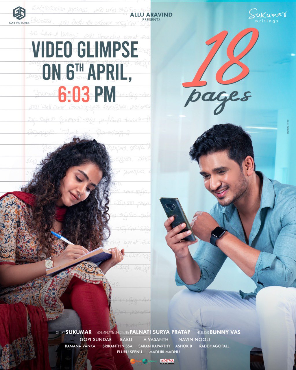 ఈ సినిమాకు పల్నాటి సూర్య ప్రతాప్ దర్శకత్వం వహిస్తుండగా అనుపమ పరమేశ్వరన్ కథానాయికగా నటిస్తోంది,  ఇది ఇలా ఉంటే తాజాగా ఈ సినిమాకు సంబంధించిన లేటెస్ట్ అప్డేట్ ను చిత్ర బృందం బయటకు వదిలింది.  18 పేజెస్ సినిమా వీడియో గ్లిమ్ప్స్ ని ఏప్రిల్ 6 వ తేదీన సాయంత్రం 6 గంటల 3 నిమిషాలకు విడుదల చేయనున్నట్లు చిత్ర బృందం తెలియజేసింది,  GA2 పిక్చర్స్ మరియు సుకుమార్ రైటింగ్స్ సంయుక్తంగా ఈ సినిమాను నిర్మిస్తున్నారు.  ఇది ఇలా ఉంటే నిఖిల్  సిద్ధార్థ్ ఈ సినిమాతో పాటు కార్తికేయ 2  సినిమాలో కూడా హీరోగా నటిస్తున్నాడు,  ఈ సినిమాకు చందు మొండేటి దర్శకత్వం వహిస్తున్నాడు.  ఈ సినిమాలో అనుపమ పరమేశ్వరన్ హీరోయిన్ గా నటిస్తోంది,  నిఖిల్ సిద్దార్థ్ ప్రస్తుతం వరుస సినిమాలతో ఫుల్ బిజీగా సమయాన్ని గడుపుతున్నాడు.