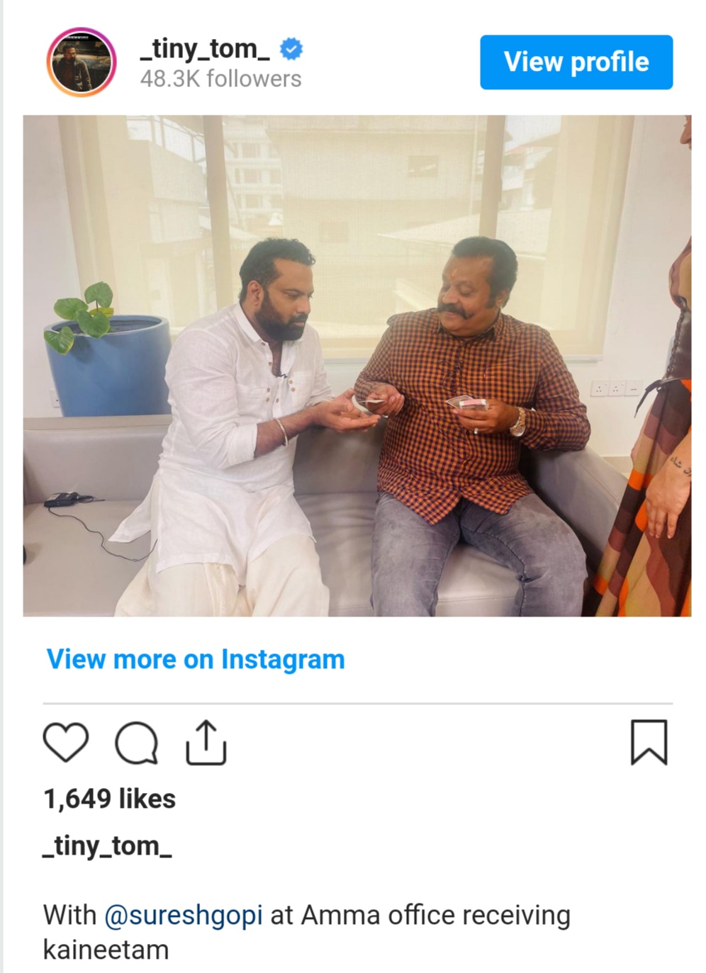 సురేష్ గోపి తన సభ్యత్వ కార్డు రుసుమును టామ్ ఇస్తూ కార్డును  కొనుగోలు చేస్తున్న చిత్రాన్ని పంచుకున్నారు. 'సురేష్ గోపీ అమ్మ  కార్యాలయంలో. నా ద్వారా కార్డు అందుకున్నారు' అని చిత్రంతో రాశారు. చాలా మంది ఈ ఫోటోను షేర్ చేసి కామెంట్స్ తో ముందుకు వచ్చారు. ఈరోజు సమావేశానికి సురేష్ గోపి కొచ్చి వచ్చారు.‘అమ్మ’ సభ్యుల సమ్మేళనం, ఆరోగ్య పరీక్షల శిబిరానికి కూడా ఆయన ముఖ్య అతిథిగా హాజరయ్యారు.