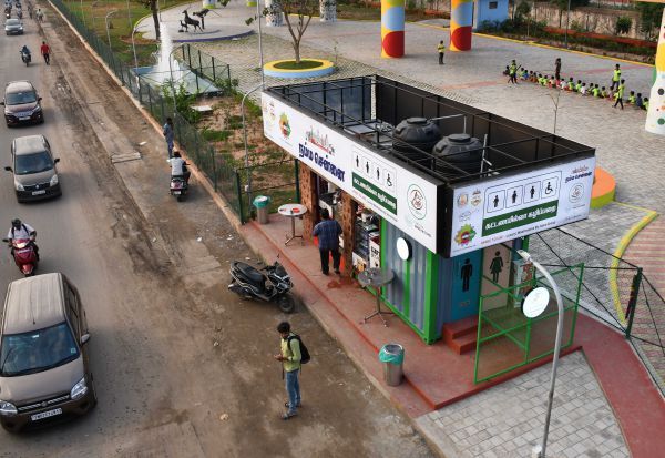 A state-of-the-art free toilet with a 'coffee shop' has been set up at rajiv gandhi Road, Adyar, Indiranagar, near the MRDS railway station. A sophisticated toilet with a coffee shop has been opened on rajiv gandhi Road in Chennai. It is found parallel to the lounges of high-rise apartments. Named 'Loocafe Thooya', the toilet is free to the public. abhishek Nath and venkatesh said that the coffee shop with this toilet is set up in a container. In this, separate facilities have been made for male, female and alternatively abled.