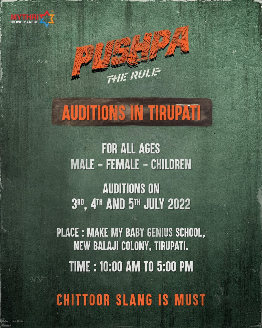 మూవీ లో నటించే అవకాశం ఉంది అని ఒక ప్రకటనను చిత్ర బృందం విడుదల చేసింది. ఆ ప్రకటనలో భాగంగా ఈ సినిమాలో నటించాలి అంటే చిత్తూరు యాస కచ్చితంగా వచ్చి ఉండాలి అని చిత్ర బృందం ప్రకటనలో తెలియజేసింది. మరి ఈ ఆడిషన్స్ తిరుపతి లో మేక్ మై బేబీ జీనియస్ స్కూల్, న్యూ బాలాజీ కాలని లో ఈ ఆడిషన్ లు జూలై 3 , 4 , 5 తేదీలలో ఉదయం 10 గంటల నుంచి సాయంత్రం 5 గంటల వరకు జరగనున్నట్లు చిత్ర బృందం ప్రకటించింది.