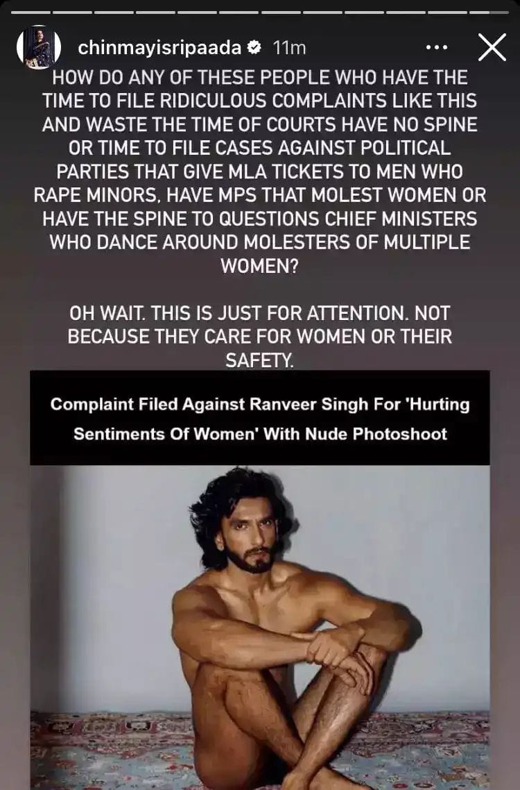 ఇక ఇలాంటి వాటిపై పాజిటివ్ గాను కాకుండా నెగిటివ్ గాను కాకుండా.. ద్వంద్వార్థం ప్రతిబింబించేలా కామెంట్లు చేయడం రాంగోపాల్ కు అలవాటు అన్న సంగతి తెలిసిందే.ఇకపోతే ఆయన కూడా రణ్వీర్ సింగ్ నగ్నంగా చేసిన ఫోటో షూట్ పై స్పందించాడు. అయితే రణ్వీర్ ధైర్యాన్ని మెచ్చుకుంటున్నట్టు కామెంట్లు చేయడం మొదలుపెట్టిన వర్మ..ఇక అటు తర్వాత ఆడవాళ్లు కూడా ఇలా చేస్తే ఇంతే మద్దతు ఇవ్వాలి, అప్పుడే సమానత్వం అన్నది ఉన్నట్టు అంటూ వర్మ పేర్కొన్నాడు. ఇదిలావుంటే ఇక తాజాగా చిన్మయి రణ్వీర్ నగ్నంగా చేసిన ఫోటో షూట్ పై స్పందించింది. ఇక మాట్లాడుతూ 'మీకు బుద్దుందా? పనీ పాట లేదా? ఇలాంటి వేస్ట్ కేసులు వేసి కోర్టు టైం వేస్ట్ చేస్తున్నారేంటి. అంతేకాదు రేప్ లు చేస్తూ దర్జాగా తిరుగుతున్న రాజకీయ నాయకులను ముందు టార్గెట్ చేయండి.అంతేకాదు ఆడవాళ్ల మధ్యలో డ్యాన్సులు వేసే సీఎంలు, మహిళలను వేధించే ఎంపీ లు చాలా మంది ఉన్నారు.ఇక ముందు వాళ్ళ పై కేసులు వేయండి.అయితే ఇదంతా జనాల అటెన్షన్ కోసమే' అంటూ ఆమె పేర్కొంది. ఇకపోతే నిజానికి చిన్మయి ఇలాంటి వాటిని అస్సలు సమర్ధించదు. అంతేకాదు కాదు ఆమె గురించి ప్రత్యేకంగా చెప్పాల్సిన అవసరం లేదు. ఆమె ఇలాంటి వాటిని అస్సలు పట్టిచుకోదు.ఇకపోతే ఇప్పుడు ఈ ఫోటోల గురించి ఆమె ఓ నెగిటివ్ కామెంట్ వేస్తే..ఇక ఇంకా ఇంకా ఈ ఫోటోల పై ఏదో ఒక కామెంట్ చేయాల్సి వస్తుందని ఆమె భావించినట్టు ఉంది...!!