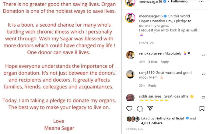 Both his lungs was damaged that had to be replaced. The reason for this is not only the disease caused by breathing the air mixed with the remains of pigeons, but Meena's husband has also contracted the coronavirus while already suffering from this disease. As a result, his health has deteriorated. As a result, he was moved to a private hospital. Meena's husband may have been saved if he had a lung transplant. But, despite his efforts till the last moment, he did not get a replacement. As a result, he died without treatment. In such a situation, meena has posted a heartfelt post today on the occasion of World Organ Donation Day.Nothing is better than saving a life. Organ donation is one such noble life-saving practice. A life-giving boon to many who suffer chronically. She has experienced it personally. If someone had done the same to her husband, her life would have changed. many lives can be saved due to organ donation.He hopes everyone will know the importance of body donation. It is not a matter between the donor and the parents and the doctors. It involves everyone, including family and immediate relatives. Today she has taken a pledge to donate her organ. This will be a sign to live her life better.