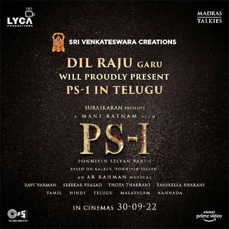 అందులో భాగంగా ఈ మూవీ నుండి  కొన్ని ప్రచార చిత్రాలను మరియు రెండు పాటలను కూడా ఇప్పటికే చిత్ర బృందం విడుదల చేసింది. వీటికి ప్రేక్షకుల నుండి మంచి ఆదరణ లభించింది.  ఈ మూవీ లో చియన్  విక్రమ్ , కార్తీ , జయం రవి ,  ఐశ్వర్య రాయ్ , త్రిష ముఖ్య పాత్రలో నటిస్తుండగా , ఏ ఆర్ రెహమాన్ ఈ మూవీ కి సంగీతాన్ని అందిస్తున్నాడు. ఈ మూవీ ని లైకా ప్రొడక్షన్స్, మద్రాస్ టాకీస్ సంస్థలు నిర్మించాయి. ఇది ఇలా ఉంటే తాజాగా ఈ మూవీ నుండి ఒక క్రేజీ న్యూస్ బయటకు వచ్చింది. ఈ మూవీ కి తెలుగు లో శ్రీ వెంకటేశ్వర క్రియేషన్స్ బ్యానర్ పై దిల్ రాజు సమర్పకుడిగా వ్యవహరిస్తున్నాడు. ఇలా టాలీవుడ్ ఇండస్ట్రీ లో మంచి క్రేజ్ ఉన్న దిల్ రాజు సమర్పకుడిగా పొన్నియన్ సెల్వన్ తెలుగు వర్షన్ విడుదల కాబోతుంది.