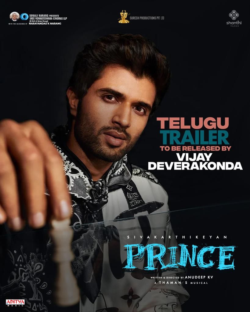 మూవీ ని అక్టోబర్ 21 వ తేదీన విడుదల చేయనున్నట్లు ఇప్పటికే మూవీ యూనిట్ అధికారికంగా ప్రకటించింది. ఈ మూవీ విడుదల తేదీ దగ్గర పడడంతో ఈ మూవీ ట్రైలర్ ని ఈ రోజు అనగా అక్టోబర్ 9 వ తేదీన విడుదల చేయనున్నట్లు చిత్ర బృందం తాజాగా అధికారికంగా ప్రకటించిన విషయం మన అందరికీ తెలిసిందే. ఇది ఇలా ఉంటే ప్రిన్స్ మూవీ యూనిట్ తాజాగా ఈ మూవీ తెలుగు ట్రైలర్ ని టాలీవుడ్ ఇండస్ట్రీ లో అదిరి పోయే క్రేజ్ ఉన్న హీరో లలో ఒకరు అయిన విజయ్ దేవరకొండ విడుదల చేయనున్నట్లు మూవీ యూనిట్ అధికారికంగా ప్రకటిస్తూ ఒక పోస్టర్ ని కూడా విడుదల చేసింది.