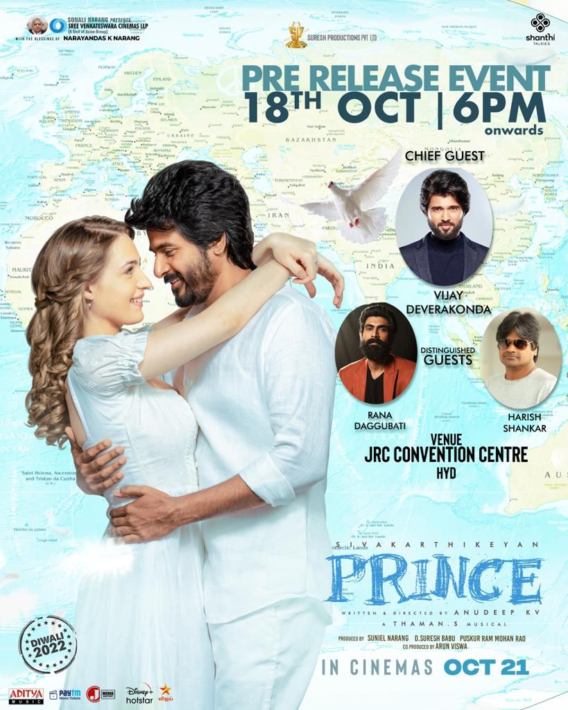 మూవీ ని తమిళ్ మరియు తెలుగు భాషల్లో ఒకే రోజు విడుదల చేయనున్నారు. ఇది ఇలా ఉంటే ఈ మూవీ విడుదల తేదీ దగ్గర పడడంతో తాజాగా ఈ మూవీ ఫ్రీ రిలీజ్ ఈవెంట్ కు సంబంధించిన ప్రకటనను మూవీ యూనిట్ చేసింది. ఇది ఇలా ఉంటే తాజాగా ఈ మూవీ ఫ్రీ రిలీజ్ ఈవెంట్ కు రాబోయే ముఖ్య అతిథులకు సంబంధించిన అధికారిక ప్రకటనను కూడా తాజాగా చిత్ర బృందం విడుదల చేసింది. ప్రిన్స్ మూవీ ఫ్రీ రిలీజ్ ఈవెంట్ ను అక్టోబర్ 18 వ తేదీన సాయంత్రం 6 గంటలకు "జే ఆర్ సి" కన్వెన్షన్ సెంటర్ , హైదరాబాద్ లో జరగనున్నట్లు , అలాగే ఈ మూవీ ఫ్రీ రిలీజ్ ఈవెంట్ కు టాలీవుడ్ ఇండస్ట్రీ లో మంచి క్రేజ్ ఉన్న హీరోలు అయినా విజయ్ దేవరకొండ ,  దగ్గుపాటి రానా , అలాగే టాలీవుడ్ సినిమా ఇండస్ట్రీ లో మంచి క్రేజ్ ఉన్న దర్శకుడు హరీష్ శంకర్ ముఖ్య అతిథులుగా రానట్లు చిత్ర బృందం అధికారికంగా ప్రకటిస్తూ ఒక పోస్టర్ ను కూడా విడుదల చేసింది.