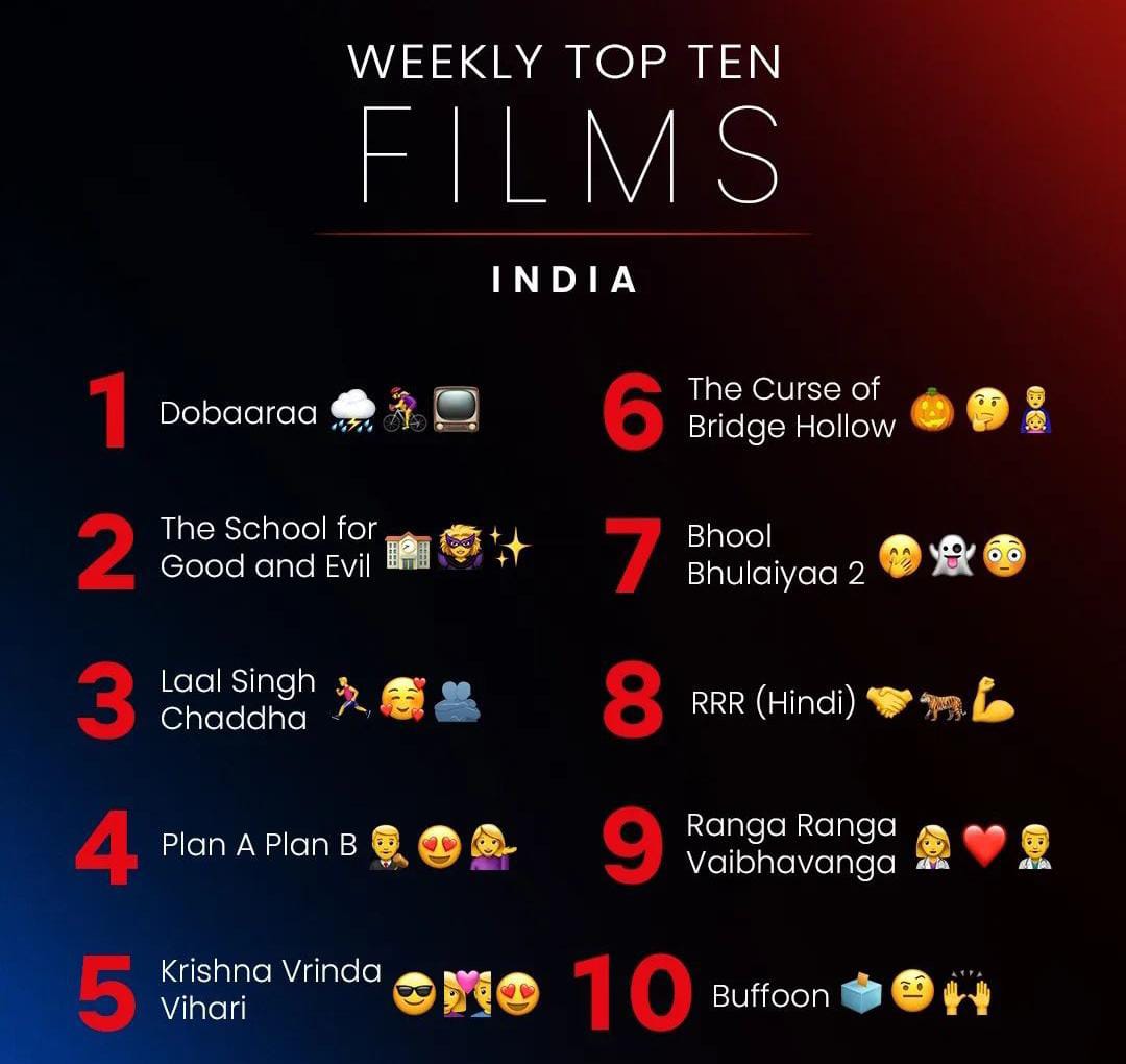 ఈ వారం నేట్ ఫ్లిక్స్ "ఓ టి టి" ప్లాట్ ఫామ్ లో బోబారా మూవీ ఫస్ట్ ప్లేస్ లో నిలిచింది. ఈ వారం నేట్ ఫ్లిక్స్ "ఓ టి టి" ప్లాట్ ఫామ్ లో ది స్కూల్ ఆఫ్ గుడ్ అండ్ ఈవిల్ మూవీ సెకండ్ ప్లేస్ లో నిలిచింది. ఈ వారం నేట్ ఫ్లిక్స్ "ఓ టి టి" ప్లాట్ ఫామ్ లో లాల్ సింగ్ చడ్డ మూవీ థర్డ్ ప్లేస్ లో నిలిచింది. ఈ వారం నేట్ ఫ్లిక్స్ "ఓ టి టి" ప్లాట్ ఫామ్ లో ప్లాన్ ఏ ప్లాన్ బి మూవీ నాలుగవ స్థానంలో నిలిచింది. ఈ వారం నేట్ ఫ్లిక్స్ "ఓ టి టి" ప్లాట్ ఫామ్ లో కృష్ణ వ్రిందా విహారి మూవీ 5 వ స్థానంలో నిలిచింది. ఈ వారం నేట్ ఫ్లిక్స్ "ఓ టి టి" ప్లాట్ ఫామ్ లో ది కోర్స్ ఆఫ్ బ్రిడ్జ్ హలో మూవీ 6 వ నిలిచింది. ఈ వారం నేట్ ఫ్లిక్స్ "ఓ టి టి" ప్లాట్ ఫామ్ లో భూల్ భులైయా 2 మూవీ 7 వ స్థానంలో నిలిచింది. ఈ వారం నేట్ ఫ్లిక్స్ "ఓ టి టి" ప్లాట్ ఫామ్ లో ఆర్ ఆర్ ఆర్ హిందీ వర్షన్ మూవీ 8 వ స్థానంలో నిలిచింది. ఈ వారం నేట్ ఫ్లిక్స్ "ఓ టి టి" ప్లాట్ ఫామ్ లో రంగా రంగా వైభవంగా మూవీ నైన్త్ ప్లేస్ లో నిలిచింది. ఈ వారం నేట్ ఫ్లిక్స్ "ఓ టి టి" ప్లాట్ ఫామ్ లో బఫూన్ మూవీ టెన్త్ ప్లేస్ లో నిలిచింది.