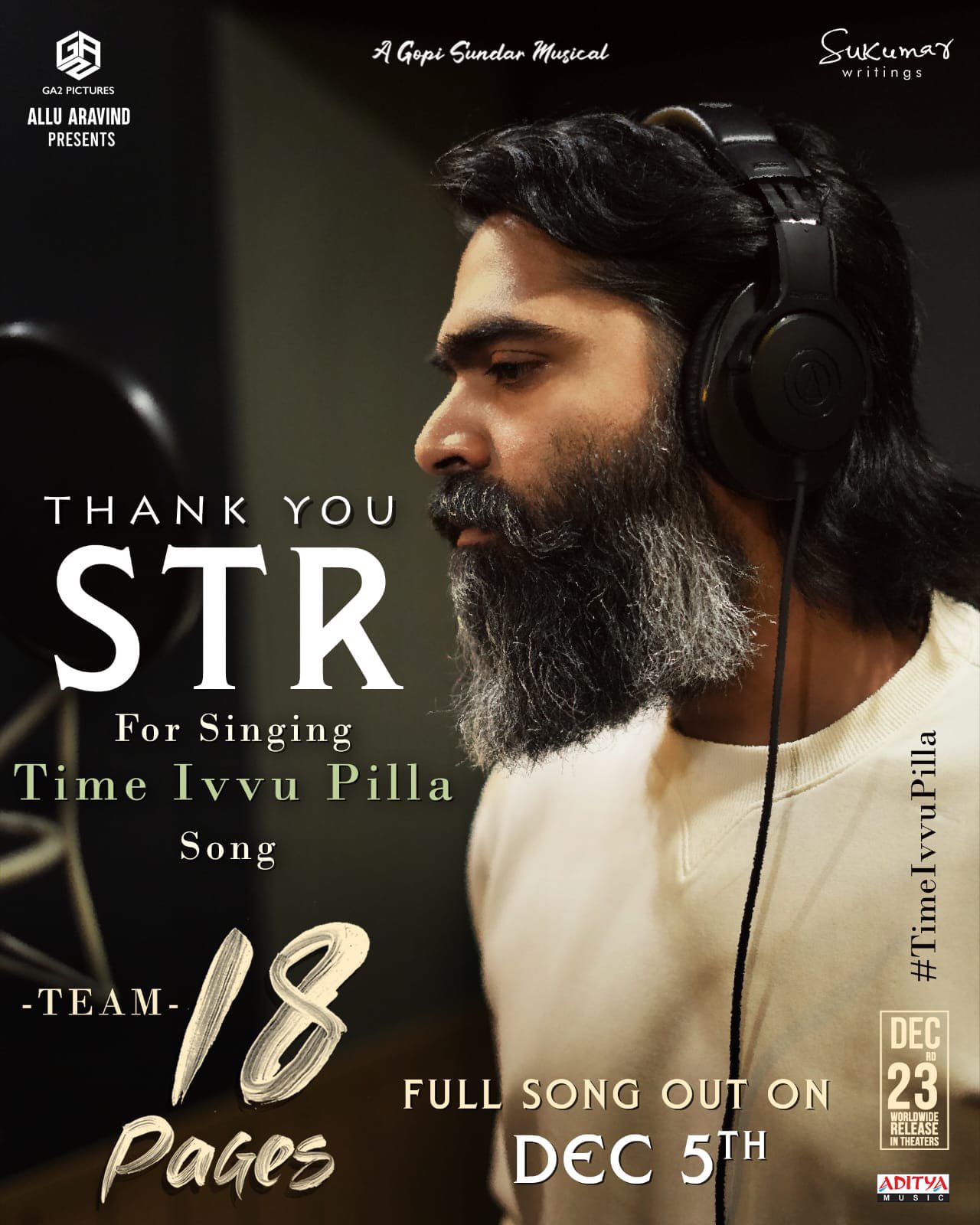 మూవీ లో తమిళ ఇండస్ట్రీ లో అద్భుతమైన క్రేజ్ ఉన్న హీరోలలో ఒకరు అయినటువంటి శింబు ఒక పాట పాడిన విషయం మన అందరికీ తెలిసిందే. తాజాగా ఈ పాటను విడుదల తేదీని ఈ చిత్ర బృందం ప్రకటించింది. శింబు ఈ మూవీ లో "టైం ఇవ్వు పిల్ల" అనే పాటను పాడాడు. ఈ పాటను డిసెంబర్ 5 వ తేదీన విడుదల చేయనున్నట్లు ఈ మూవీ యూనిట్ అధికారికంగా ప్రకటిస్తూ ఒక పోస్టర్ ను కూడా విడుదల చేసింది. చిత్ర బృందం విడుదల చేసిన ఈ పోస్టర్ లో శింబు కి మూవీ యూనిట్ థ్యాంక్స్ చెబుతూ , శింబు కు సంబంధించిన ఒక ఫోటోను విడుదల చేసింది. ప్రస్తుతం ఈ చిత్ర బృందం విడుదల చేసిన ఈ ఫోటో సోషల్ మీడియాలో వైరల్ అవుతుంది. ఇప్పటికే కార్తికేయ 2 మూవీ తో మంచి విజయాన్ని అందుకున్న నిఖిల్ మరియు అనుపమ పరమేశ్వరన్ లు ఈ మూవీ తో ఏ రేంజ్ విజయాన్ని అందుకుంటారో చూడాలి.