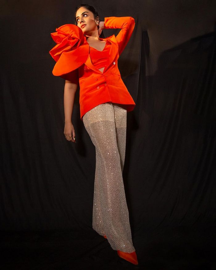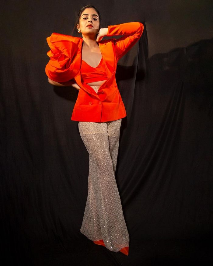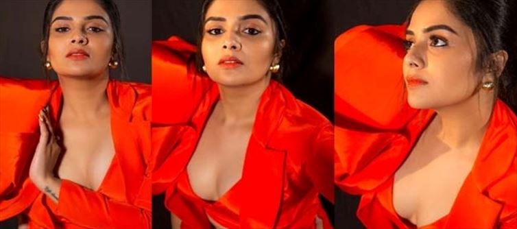 The actress looks really lovely in her creative outfit, and the red high heels just enhance her beauty. Her feminine aura was accentuated by the ear earrings and her tied-back hair. Her splendour was given even more punch by the low neck. sreemukhi has a long career ahead of her because she is the most alluring woman on both the big and small screens.