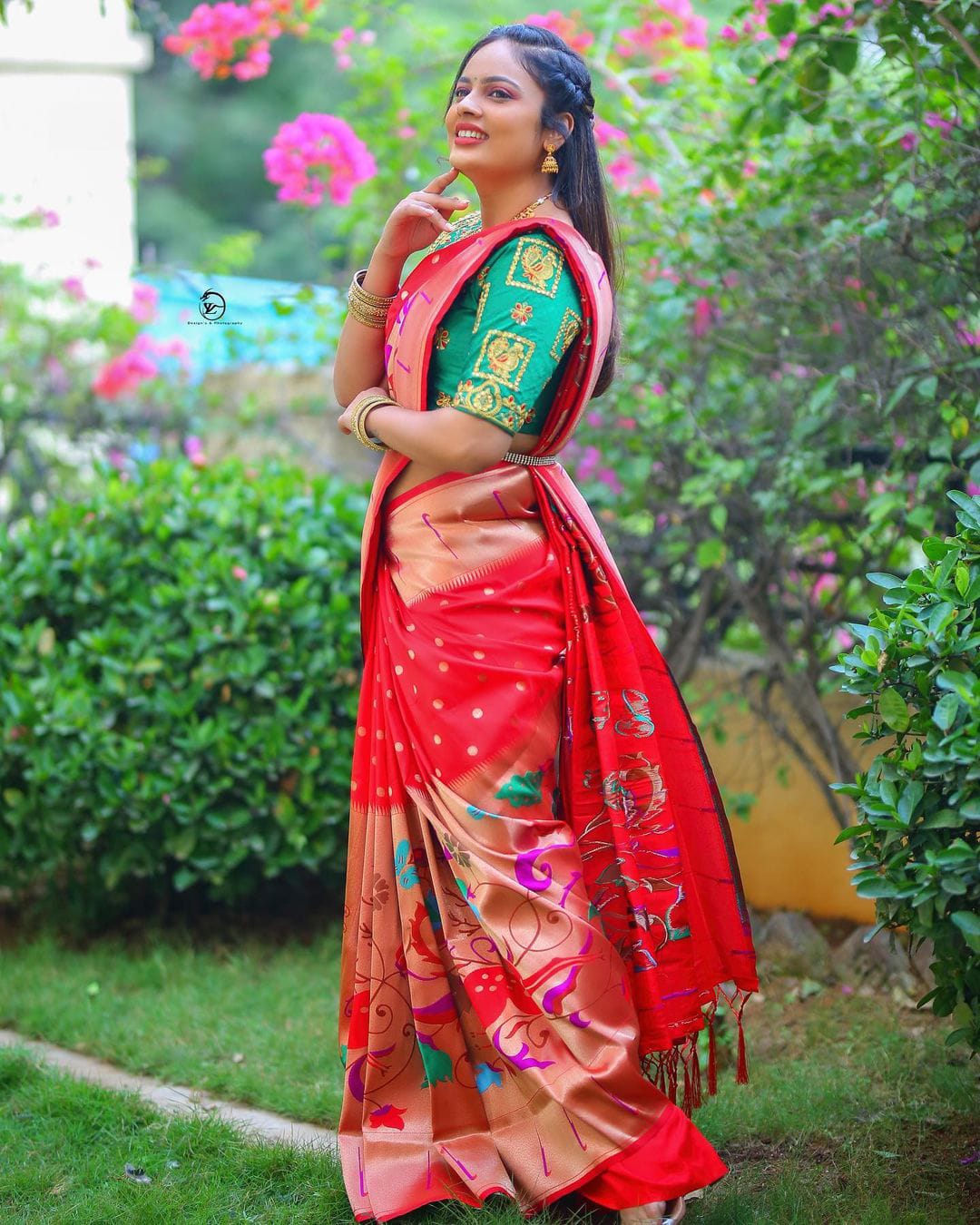 రెడ్ కలర్ లో ఉన్న శారీని కట్టుకొని , బ్లూ కలర్ లో ఉన్న బ్లౌజ్ ను ధరించి చాలా ట్రెడిషనల్ అండ్ క్లాస్ అండ్ డీసెంట్ లుక్ లో ఫోటోలకు స్టిల్స్ ఇచ్చింది. ప్రస్తుతం