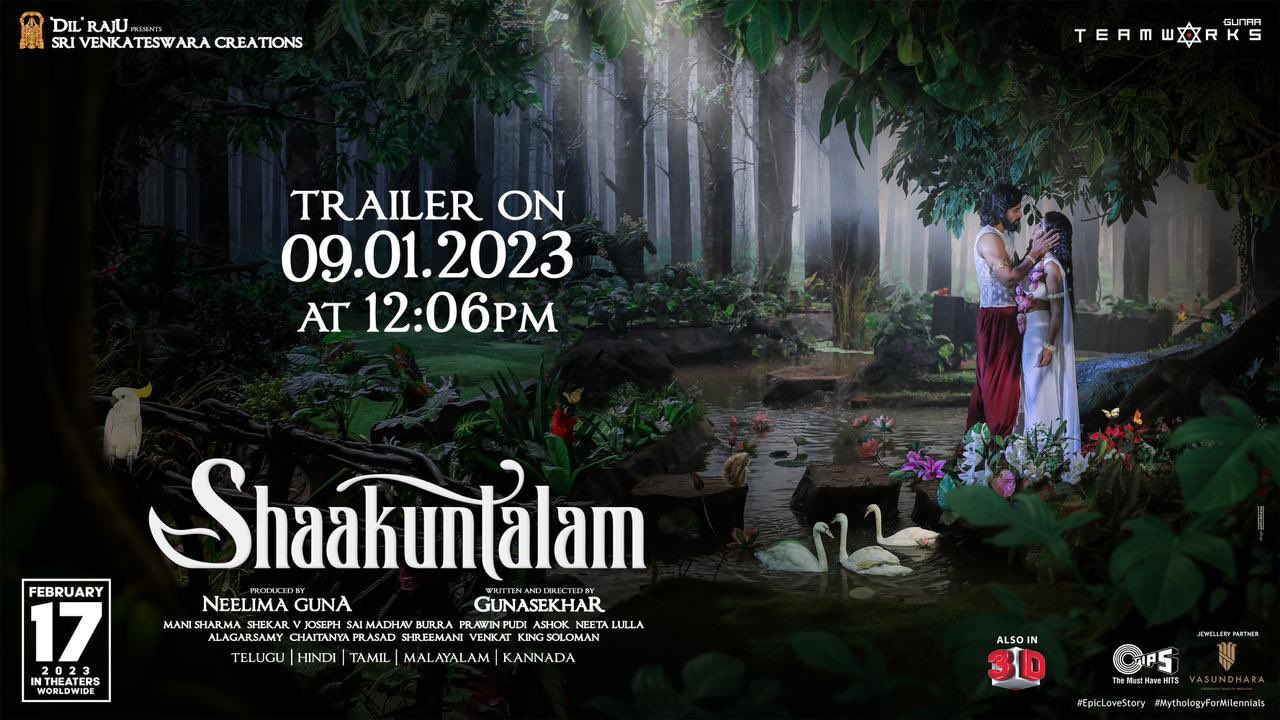 మూవీ విడుదల తేదీ దగ్గర పడడంతో తాజాగా ఈ సినిమా యూనిట్ ఈ మూవీ కి సంబంధించిన మరో అదిరిపోయే అప్డేట్ ను ప్రకటించింది. తాజాగా శాకుంతలం మూవీ యూనిట్ ఈ సినిమా ట్రైలర్ విడుదల తేదీని అధికారికంగా ప్రకటించింది.  ఈ మూవీ యొక్క ట్రైలర్ ను 9 జనవరి 2023 వ తేదీన మధ్యాహ్నం 12 గంటల 06 నిమిషాలకు విడుదల చేయనున్నట్లు ఈ మూవీ యూనిట్ అధికారికంగా ప్రకటిస్తూ ఒక పోస్టర్ ను కూడా విడుదల చేసింది. తాజాగా ఈ చిత్రం బృందం ట్రైలర్ అప్డేట్ ఇచ్చిన పోస్టర్ సోషల్ మీడియాలో వైరల్ అవుతుంది.