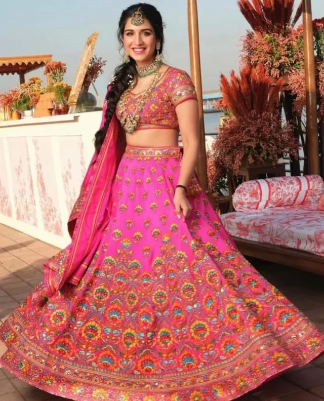 Anant Ambani's bride-to-be radhika Merchant looked stunning in a fuchsia pink lehenga as she applied beautiful henna on her hands at her mehendi ceremony. Her pink lehenga was embroidered with flowers in orange, green, and blue. radhika sat opposite the marigold-strewn backdrop and accessorized her look with pink dewy makeup. Moreover, she opted for a braided hairdo to complete her look.