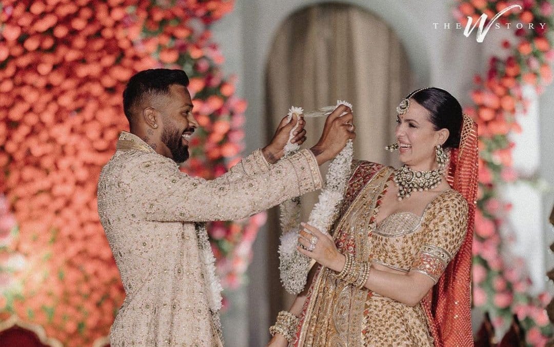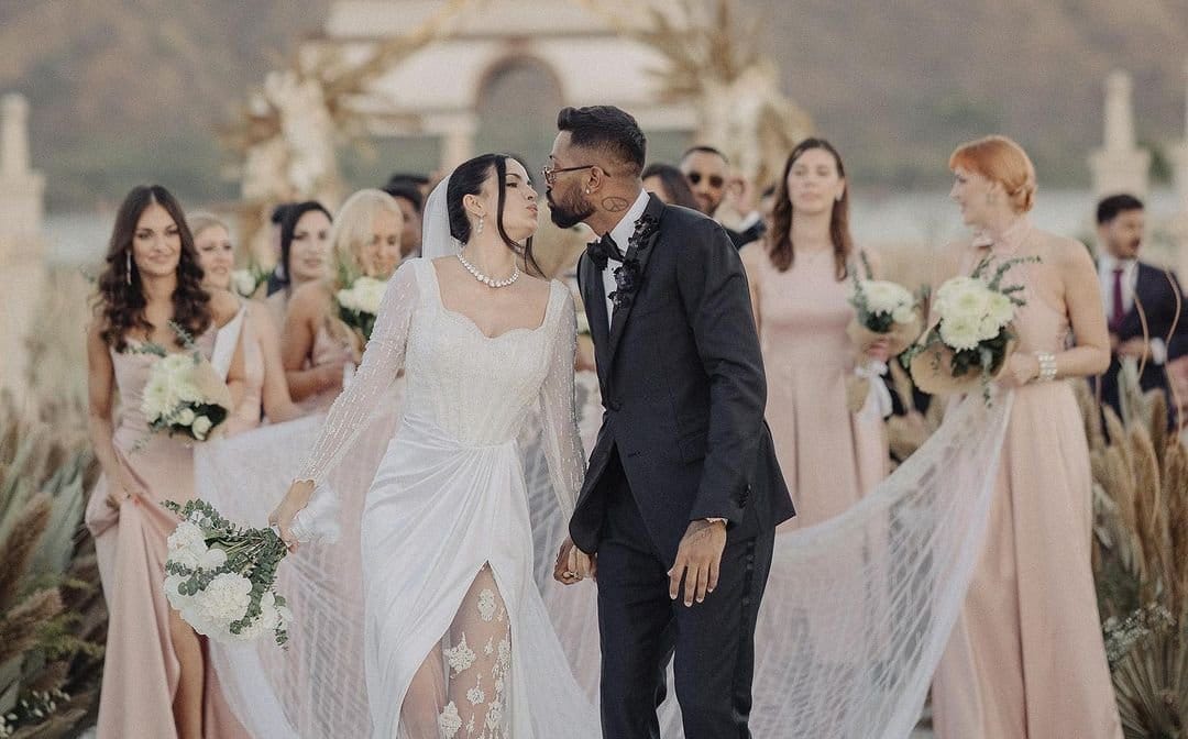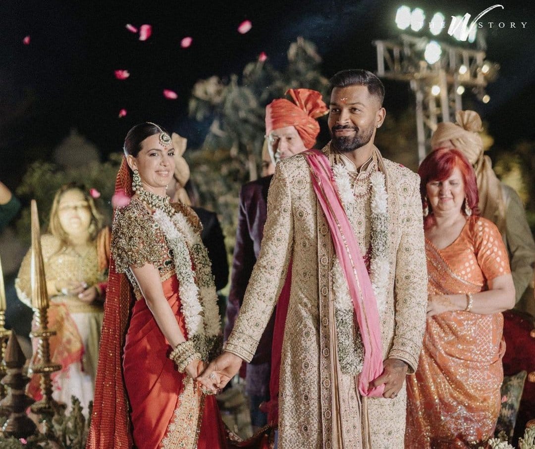 The couple first exchanged rings, then walked seven steps around Agnihotra and got married again. On this occasion, hardik was shocked by the vermilion on his wife's forehead. Thus they were once again united according to the Hindu Christian tradition. As part of the Christian marriage tradition, natasha wore a long and beautiful white gown.