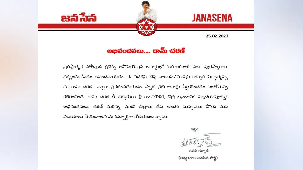 ప్రతిష్టాత్మక హాలీవుడ్ క్రిటిక్స్ అసోసియేషన్ అవార్డులో rrr చిత్రానికి పురస్కారాలు దక్కించుకోవడం ఆనందదాయకం ఈ వేదిక పైన బెస్ట్ వాయిస్ మోషన్ క్యాప్చర్ పెర్ఫార్మషన్స్ కు రామ్ చరణ్ కు అవార్డు ప్రకటించడం స్పాట్లైట్ అవార్డు స్వీకరించడం చాలా ఆనందాన్ని కలిగిస్తోందని తెలియజేశారు. రామ్ చరణ్ కు డైరెక్టర్ రాజమౌళికి చిత్ర బృందానికి తన హృదయపూర్వకంగా అభినందనలు తెలియజేయడం జరిగింది. రామ్ చరణ్ రాబోయే రోజుల్లో మరిన్ని మంచి చిత్రాలు చేసి ప్రేక్షకులను బాగా అలరిస్తూ ఘనవిజయాలను సాధించాలని మనస్ఫూర్తిగా కోరుకుంటున్నాను అని పవన్ కళ్యాణ్ జనసేన ద్వారా ఒక లెటర్ ని విడుదల చేయడం జరిగింది. ప్రస్తుతం అందుకు సంబంధించి ఒక లెటర్ వైరల్ గా మారుతోంది.
