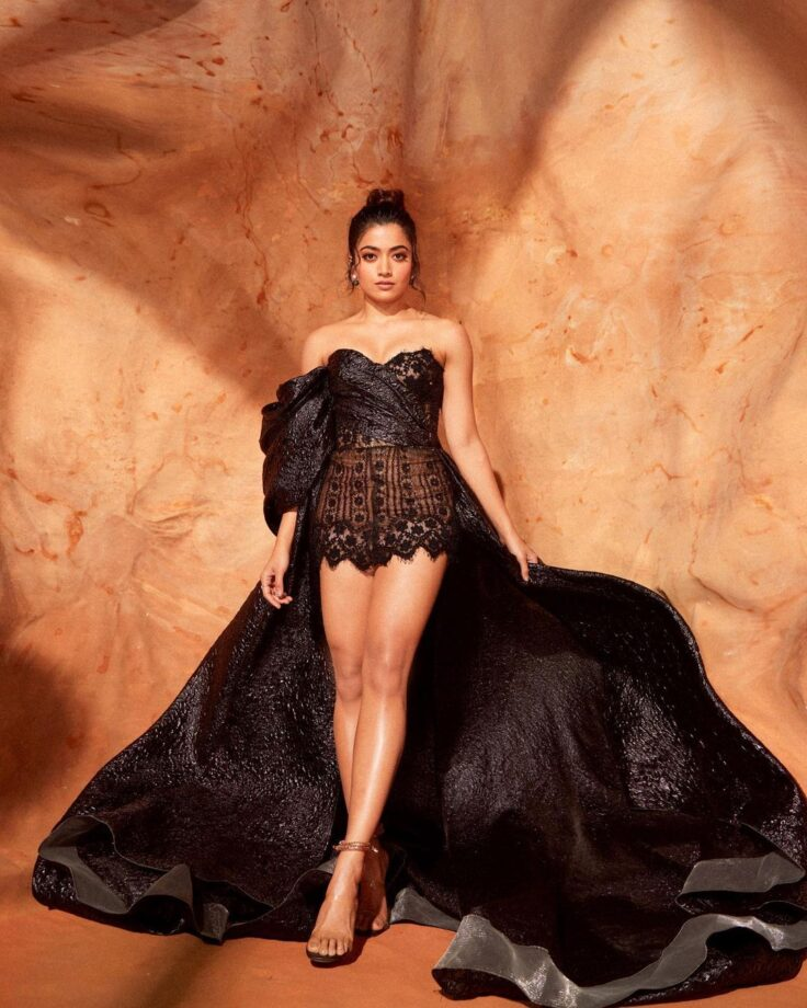 The pushpa actress gained notoriety for donning a tiny black lace dress. The Tal Kedem Couture dress has a sheer underlayer underneath a layer of black lace. The dress has a billowing train attached to the back and an asymmetric cold shoulder design. She wore a bold dress and strappy, barefoot stilettos. rashmika had beautiful, sparkly makeup and her hair was in a sloppy top knot. Although the appearance was criticised by conservatives, there is little question that dramatic play with dimensions will continue to be popular.