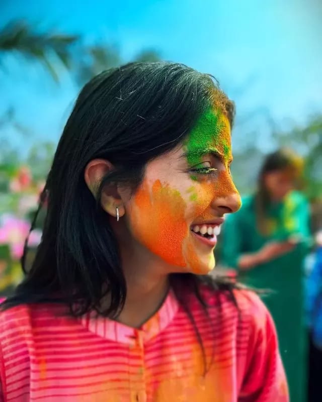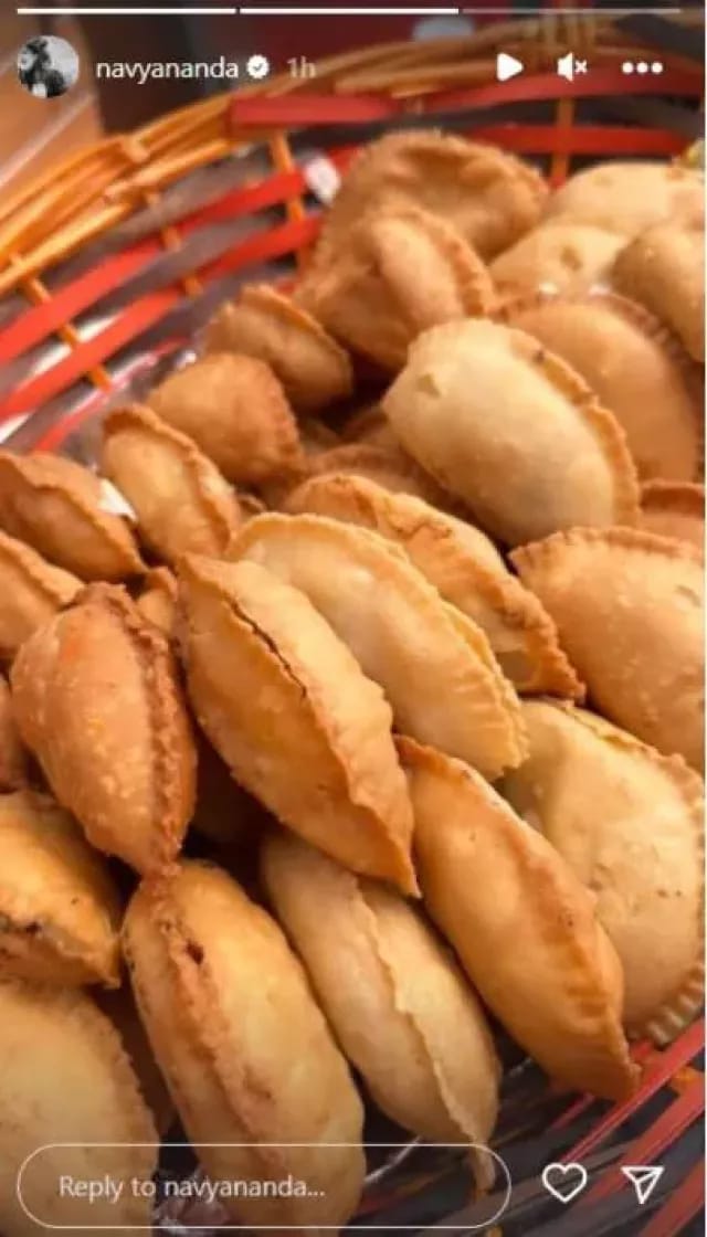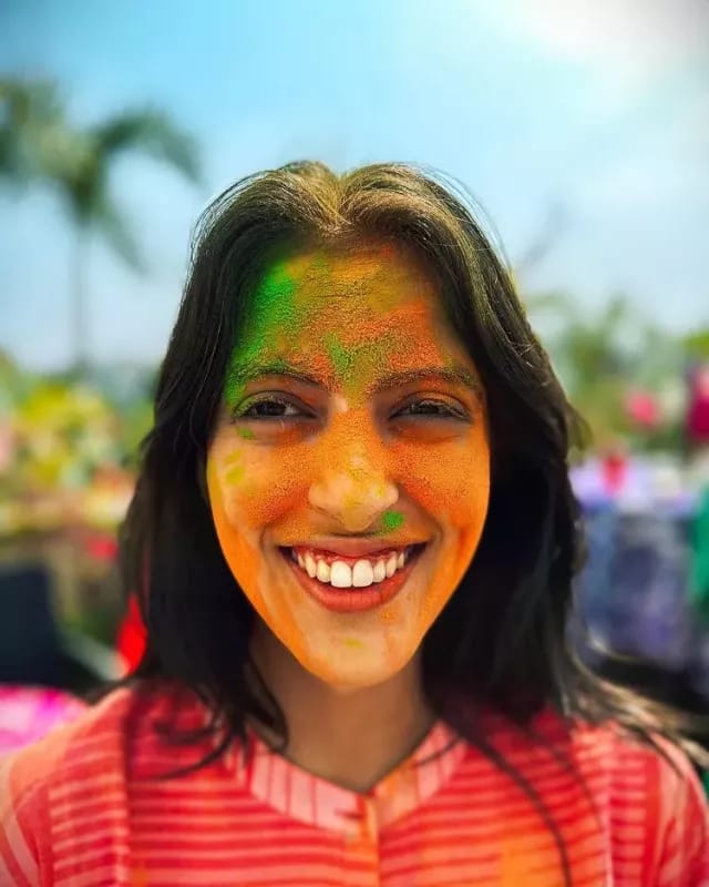 On 8th march 2023, Navya Naveli Nanda shared a picture from her insta handle, in which she was completely immersed in color and it showed her love for the festival. Covering her face completely with green and orange gulal, Navya was seen flashing her beautiful smile as she clicked a selfie. She also shared a picture of a basket full of 'gujiyas', savoring the traditional sweet on the occasion of Holi.