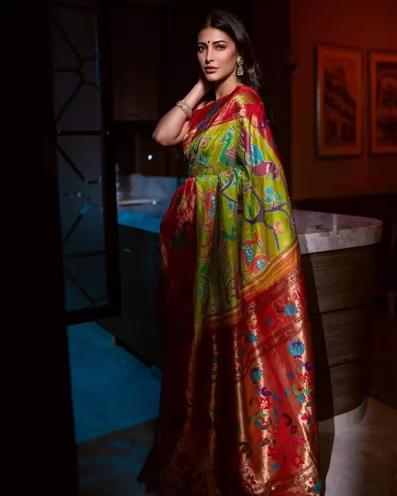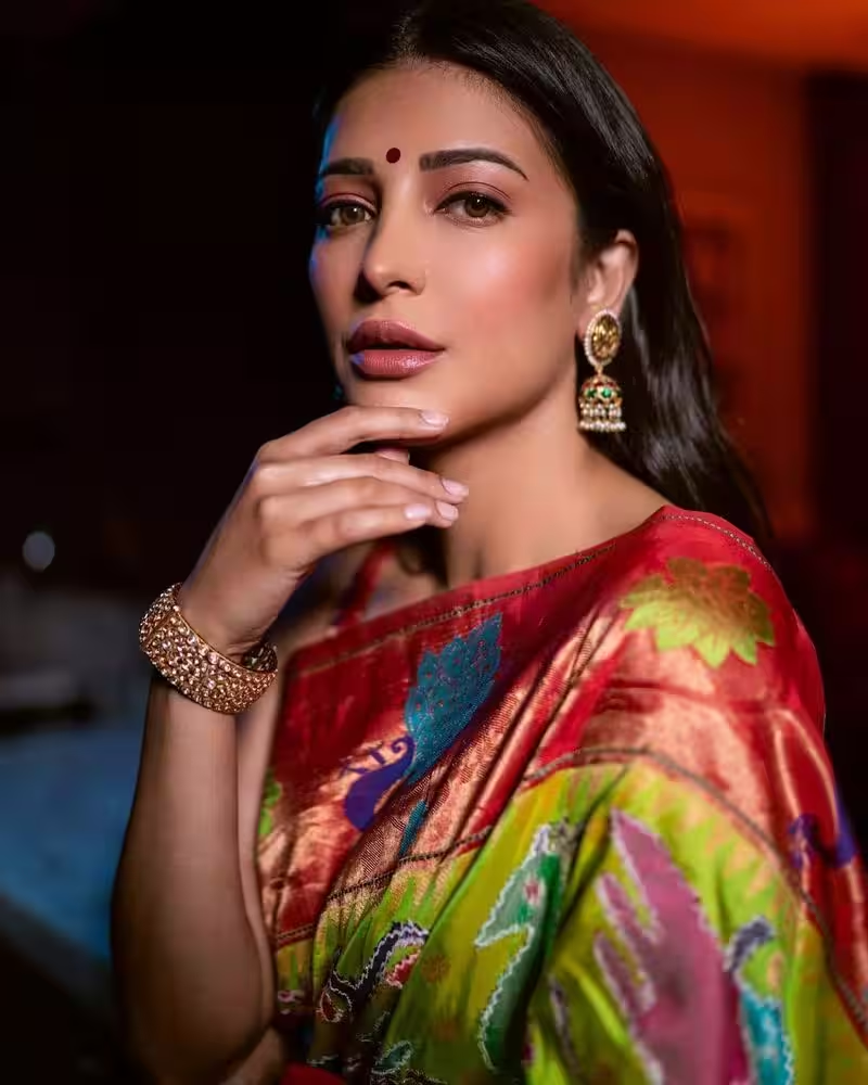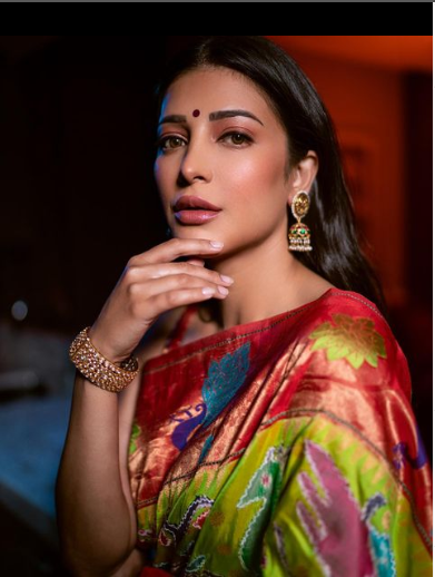 శృతిహాసన్ తాజాగా చీరలో మెరిసిపోయే అందాలను ప్రదర్శిస్తోంది .చాలావరకు ట్రెండి వేర్లో పొట్టి దుస్తులలో తన అందాలను చూపిస్తూ ఉండే ఈ ముద్దుగుమ్మ ఇప్పుడు చీరలో మైమరిపించేలా చేస్తోంది. శృతిహాసన్ లేటెస్ట్ సిల్క్ చీరలు మెరిసిపోతూ ఎర్రని కొంగు కలిగిన ఆకుపచ్చ చీరలో హోయలు పలుకుతూ అందాలను చూపిస్తోంది. ఈ ముద్దుగుమ్మ ఫోటోలు అభిమానులు తెగ వైరల్ గా చేస్తున్నారు. స్టార్ హీరోయిన్గా ప్రస్తుతం వరుస విజయాలను అందుకుంటుంది ఈ ఏడాది సంక్రాంతికి తన హవా కొనసాగించింది.శృతిహాసన్ నటించిన తెలుగు సినిమాలన్నీ వరుసగా విజయాలు అందుకుంటున్నాయి. కెరియర్ బిగినింగ్ అనగనగా ఒక ధీరుడు, ఓ మై ఫ్రెండ్, రామయ్య వస్తావయ్య వంటి చిత్రాలు ఈమె కెరియర్ లో డిజాస్టర్ గా మిగిలాయి కానీ గబ్బర్ సింగ్ ,బలుపు రేసుగుర్రం, ఎవడు ,శ్రీమంతుడు తదితర చిత్రాలు బ్లాక్ బస్టర్ విజయాలను అందుకున్నాయి. అయితే ఆ తర్వాత కాస్త గ్యాప్ ఇచ్చిన ఈ ముద్దుగుమ్మ క్రాక్ సినిమాతో మళ్లీ సక్సెస్ను అందుకుంది పవన్తో వకీల్ సాబ్ సినిమాలో నటించి పర్వాలేదు అనిపించుకుంది. ప్రస్తుతం ఈ ముద్దుగుమ్మ ప్రభాస్తో సలార్ సినిమాలో నటిస్తున్నది. ఈ సినిమా షూటింగ్ ప్రస్తుతం జరుగుతోంది.