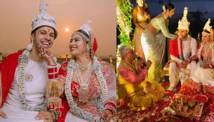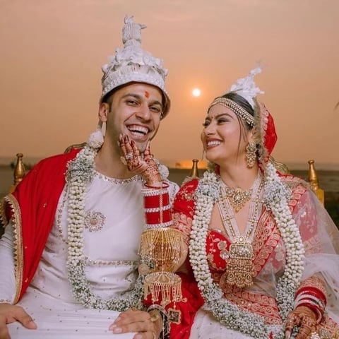 Talking about the couple's wedding look, the couple twinned in red and white outfits for the bengali wedding. While krishna looked the perfect bengali bride in a red and white lehenga and mukut (traditional headgear), Chirag matched his bride in a white sherwani and red dupatta