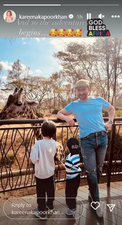 Kareena Kapoor Khan today i.e. 14th march 2023 shared a lovely picture from her Africa vacation on her instagram story. This is the first picture from the trip and it features ali KHAN' target='_blank' title='saif ali khan-Latest Updates, Photos, Videos are a click away, CLICK NOW'>saif ali khan, Taimur ali Khan, and Jehangir ali Khan, the three boys in Bebo's life. In the picture, Saif looks dapper in a light blue T-shirt, which he has paired with denim of the same color. He wore a beige cap and completed his look with white shoes. He seems to be posing for his wife, but the kids seem more interested in looking at the giraffe, which is standing right in front of them. Both Taimur and Jeh look adorable looking at the giraffe with their backs to the camera.
