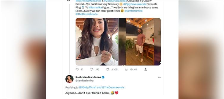 Rashmika actually doesn't comment on rumors about her personal life, but she finally spoke up. However, rashmika responded to a message on social media to refute the relationship rumors. rashmika retorted, "Aiyoooo... don't overthink babu. Along with keeping a low profile regarding his personal life, vijay deverakonda is also avoiding questions about rashmika and their relationship status in "Geetha Govindam." After starring in films like geetha govindam and Dear Comrade, rashmika mandanna and Vijay Deverakonda's chemistry has always been the buzz of the town. Despite their claims to be "just friends," their camaraderie, continual support, and casual meetings have only served to fuel the speculations of their romance.