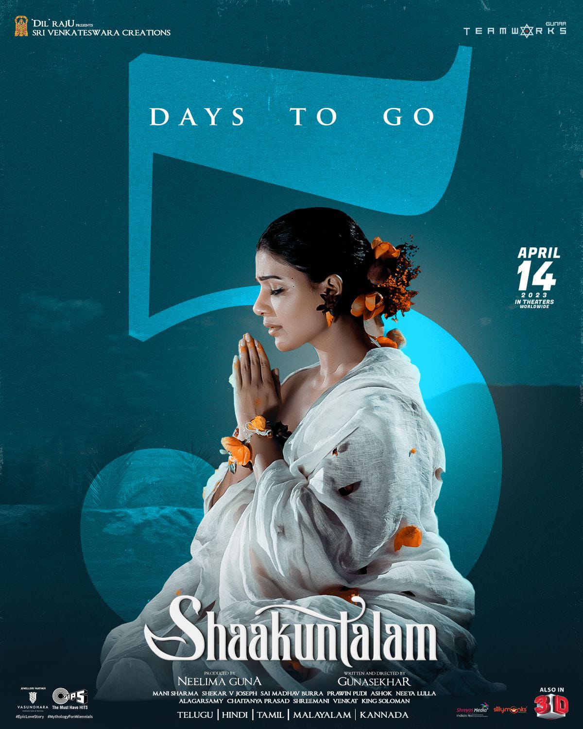 మూవీ ని తెలుగు , తమిళb, కన్నడ , మలయాళ , హిందీ , భాషలలో ఏప్రిల్ 14 వ తేదీన 2D మరియు 3D వర్షన్ లలో విడుదల చేయనున్నారు.మూవీ విడుదల తేదీ దగ్గర పడడంతో ఇప్పటికే ఈ సినిమా బృందం ఈ మూవీ నుండి కొన్ని ప్రచార చిత్రాలను విడుదల చేయగా వాటికి ప్రేక్షకుల నుండి సూపర్ రెస్పాన్స్ లభించింది. ఈ మూవీ విడుదల కావడానికి ఇంకా కేవలం 5 రోజులు మాత్రమే మిగిలి ఉంది. దానితో ప్రస్తుతం ఈ మూవీ యూనిట్ ఈ సినిమా ప్రమోషన్ లను చాలా స్పీడ్ గా నిర్వహిస్తుంది. మరి ఆఖరుగా యశోద మూవీ తో అద్భుతమైన విజయాన్ని అందుకున్న సమంతమూవీ తో ఏ రేంజ్ విజయాన్ని అందుకుంటుందో చూడాలి.