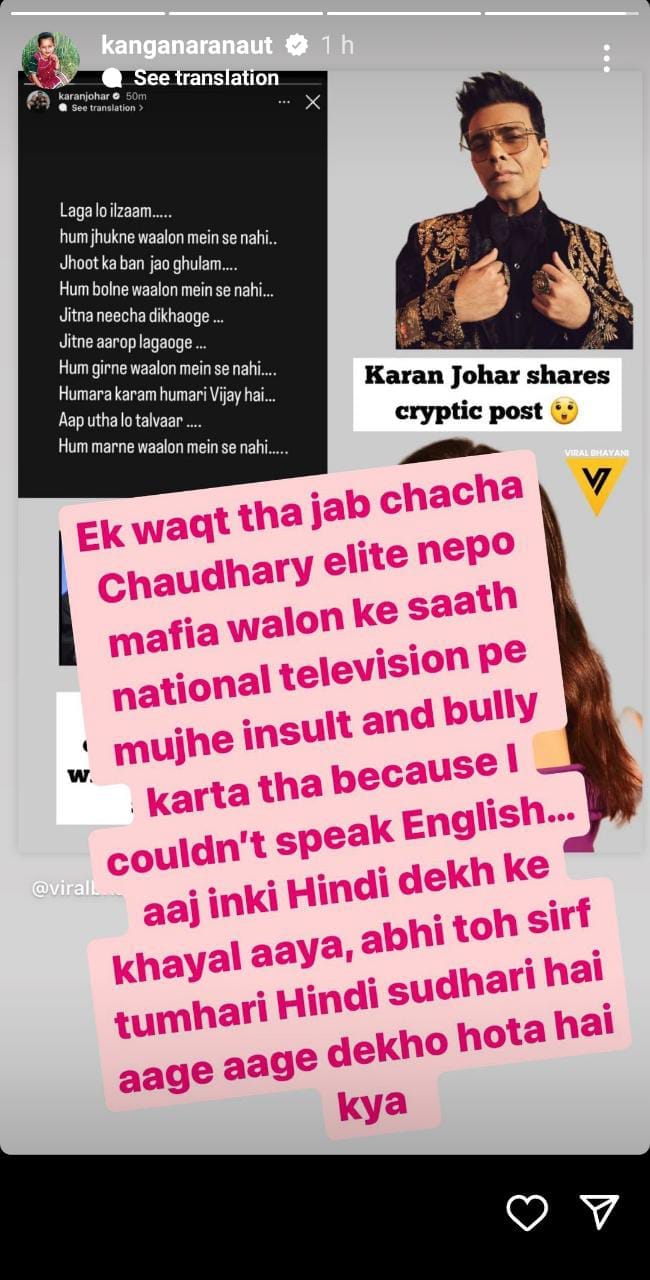 Bollywood filmmaker karan johar is constantly in the limelight these days. karan is called the king of nepotism in the industry. Many allegations have been leveled against karan in the last few days. At the same time, bollywood actress kangana ranaut also does not hold back from besieging him on any issue. The cold war between the two is not taking the name of ending. Last day, the filmmaker targeted kangana through a social media post without naming her. At the same time, now the bollywood queen has retaliated in a very interesting way on this post of hers.