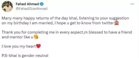 In the photo shared on twitter by Fahadh Ahmed, Swara is smiling and sitting next to her husband. He has put his head on her shoulder. Sharing the photo, the politician wrote, "Many happy returns of the day brother, I am married now after following your suggestion, I hope you will know from Twitter. Thank you for completing me in every aspect, I love you." Blessed to have such a friend and mentor. I love you my heart. Note- brother is gender neutral.'' However, Swara is yet to respond to the post.