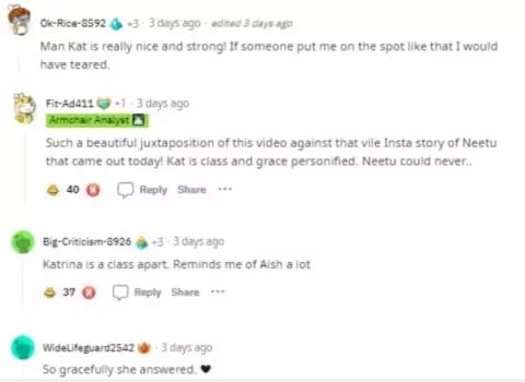 Amidst all this uproar, an old video of katrina kaif has surfaced online, in which she is seen showering love on Neetu Kapoor. The video is from Katrina's old interview with senior journalist karan Thapar at 'India Today Conclave'. During the interview, the journalist asked katrina some personal questions, which were difficult for her, but she kept herself calm and composed. The video is now going viral on 'Reddit' and netizens are praising Katrina's mature reaction.