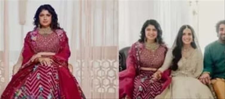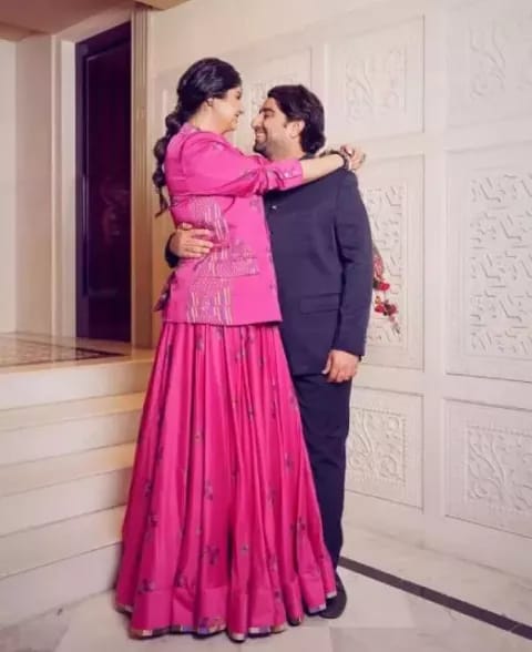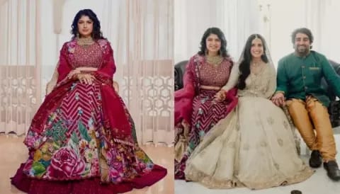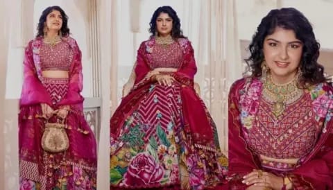 For her friend's wedding, Anshula rani looked gorgeous in a pink lehenga-choli, which consisted of a layered skirt, a heavily embellished choli, and a matching dupatta with tassels on the hemline. She paired her look with Kundan jewelry, studded with several precious stones. Her jewelry included a wide neckpiece, matching earrings, gold bangles, and a statement ring. She also carried a wallet purse to complete her look. Apart from this, highlighted cheeks, glossy lips, glittery eyeshadow, and wavy open tresses completed her look.