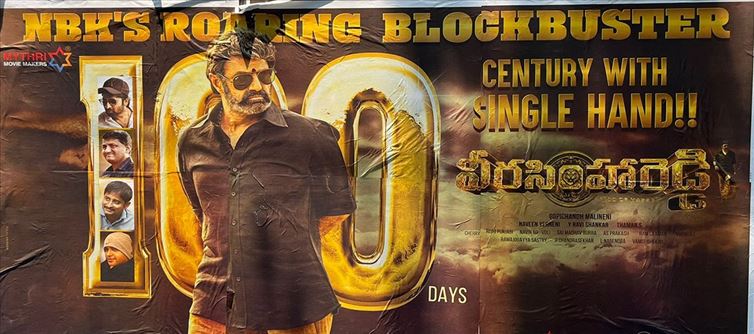 "Roaring smash from NBK. Century with One Hand" is written on the poster. The underlying message here might be that chiranjeevi required ravi teja in this multi-starrer, Veerayya, but balakrishna single-handedly won box office jackpot and achieved a 100-day run with Veera simha Reddy. It is typical for the posters of competing films to poke fun at one another; in the past, this happened with sarileru neekevvaru and Ala Vaikunthapurramulo.