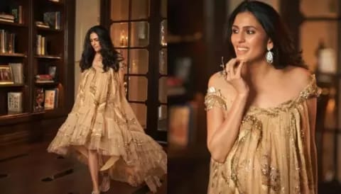 She paired the yellow saree with a contrasting blouse and a silk dupatta draped like a shawl. She complemented her look with diamond earrings, maang tikka, and bangles. When Shloka Mehta flaunted her baby bump in an organza dress. For the third day of the 'NMACC' launching event on 2nd april 2023, Shloka Mehta wore a beige organza dress from the collection of well-known designer rahul Mishra. Shloka completed her look with diamond danglers, a statement ring, and silver sandals.