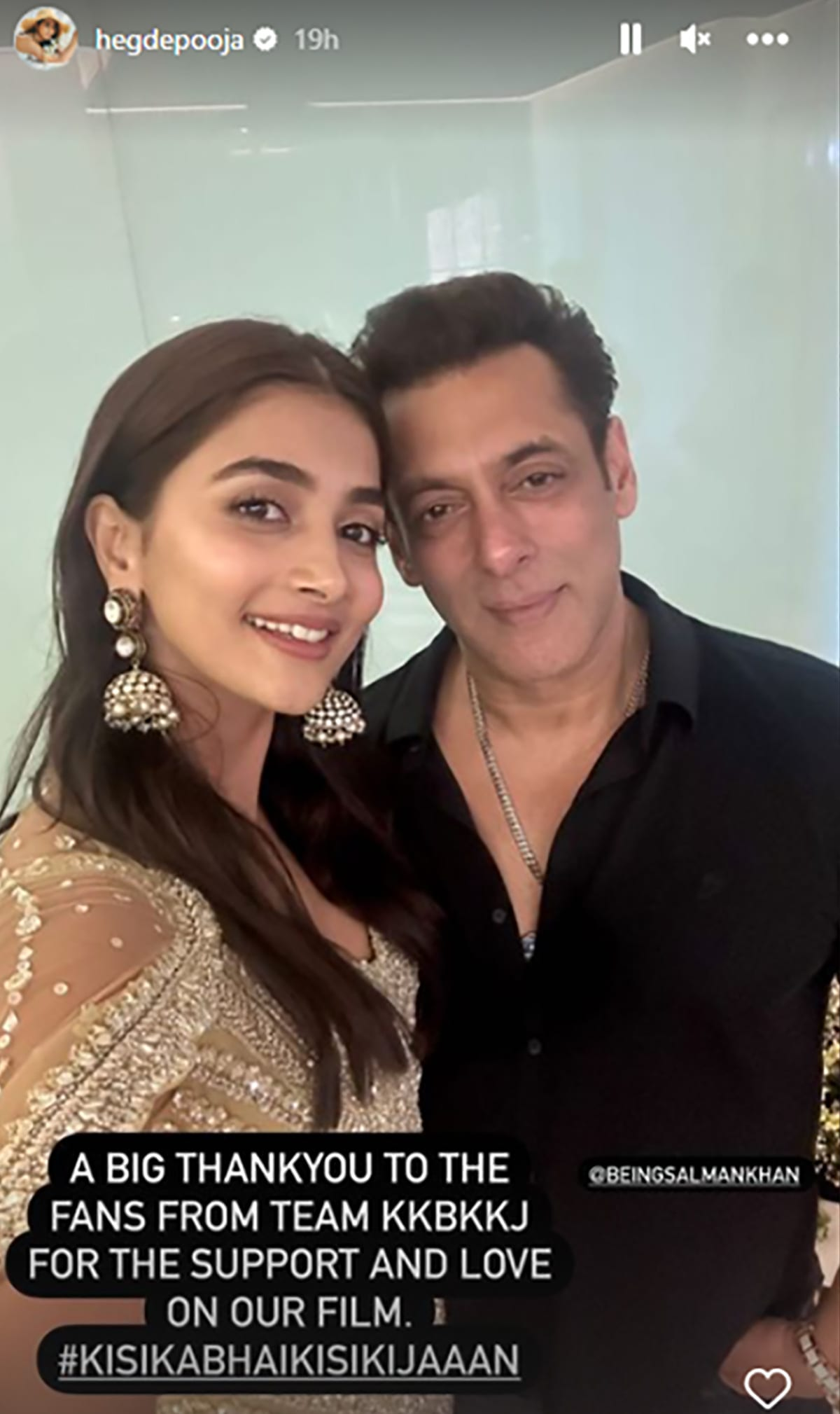 Pooja Hegde, who co-starred with salman khan in Kisi Ka Bhai Kisi Ki jaan, took a break and posted a flashback photo with him. She added in her caption to thank her admirers. "A big thank you to the team KKBKKJ fans for their love and support of our film," Alongside salman khan, pooja hegde recently appeared in Kisi Ka Bhai Ki Jaan. venkatesh Daggubati, Shehnaaz Gill, Palak Tiwari, Raghav Juyal, Vijender Singh, and siddharth Nigam were also featured in the movie. The movie came out on Friday.
