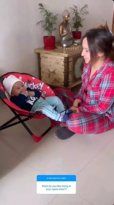When asked what she likes to do in her free time, the new mom shared an adorable boomerang video. In the clip, she was seen sitting on the floor while her baby was lying on a 'Mickey Mouse' chair and it looked super adorable the way she was making him laugh.