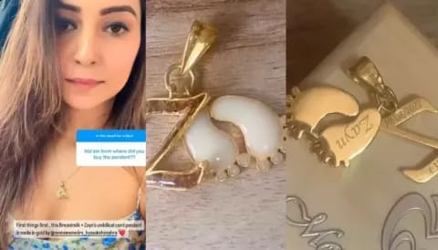 Sharing the picture, Vinnie shared that her pendant is filled with her breast milk and her son Zain's umbilical cord stump. She wrote, "First things first, this breast milk + Zain cord pendant is made in GOLD."