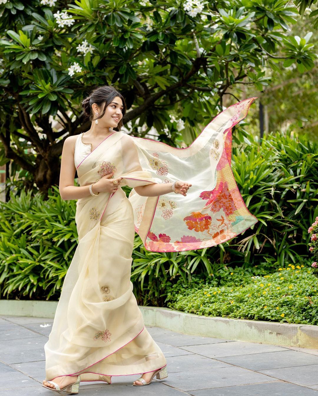 ఇలా వరుస సినిమాలతో ప్రేక్షకులను అలరిస్తున్న ఈ బ్యూటీ సోషల్ మీడియాలో కూడా చాలా యాక్టివ్ గా ఉంటూ తనకు సంబంధించిన ఫోటోలను పోస్ట్ చేస్తూ వస్తుంది. అందులో భాగంగా తాజాగా కృతి అదిరిపోయే లుక్ లో ఉన్న శారీని కట్టుకొని అందుకు తగిన స్లీవ్ లెస్ బ్లౌజ్ ను ధరించి క్యూట్ స్మైల్ తో ఫోటోలకు స్టిల్స్ ఇచ్చింది. ప్రస్తుతం కృతి కి సంబంధించిన ఈ ఫోటోలు అదిరిపోయే రేంజ్ లో సోషల్ మీడియాలో వైరల్ అవుతున్నాయి.